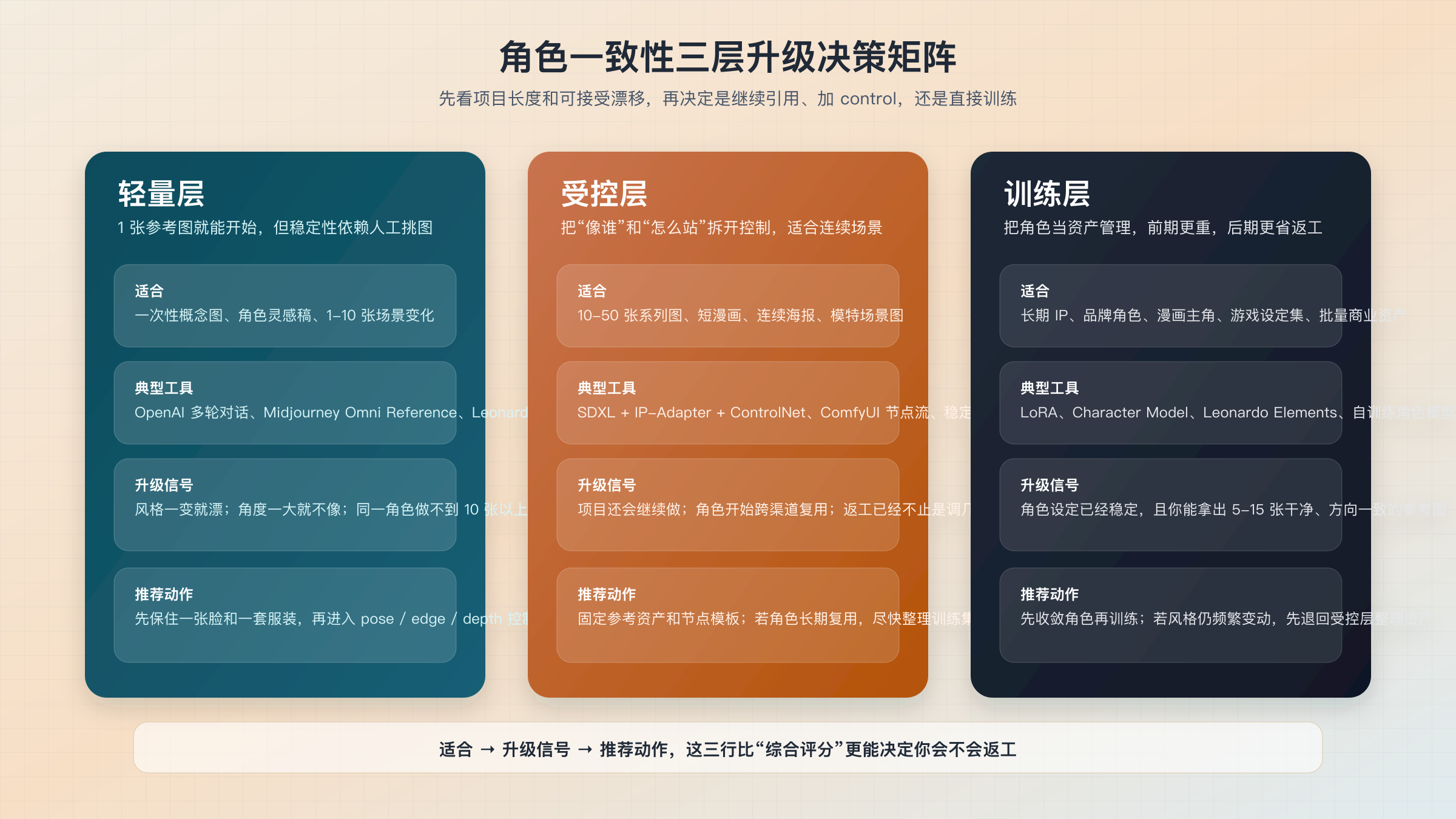 | 训练层 | 长期 IP、品牌角色、漫画主角、游戏设定集、批量商业资产 | LoRA、Character Model、Leonardo Elements、自训练角色模型 | 前期准备最重;需要更好的素材纪律 | 角色设计频繁变化、训练集质量不稳定 | 先回到受控层收敛设计,再重做训练集 |