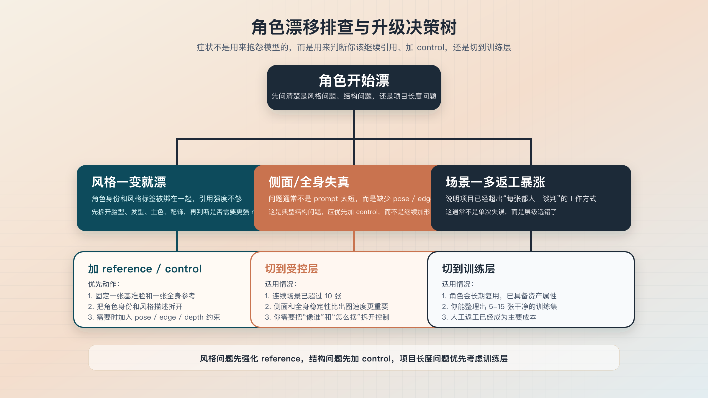 如果你只记住一句话, 就记住这句: **角色开始漂的时候, 先问是不是该换层级, 而不是先问是不是该多写几句 prompt。 ** 这比任何“万能参数模板”都更能减少返工。