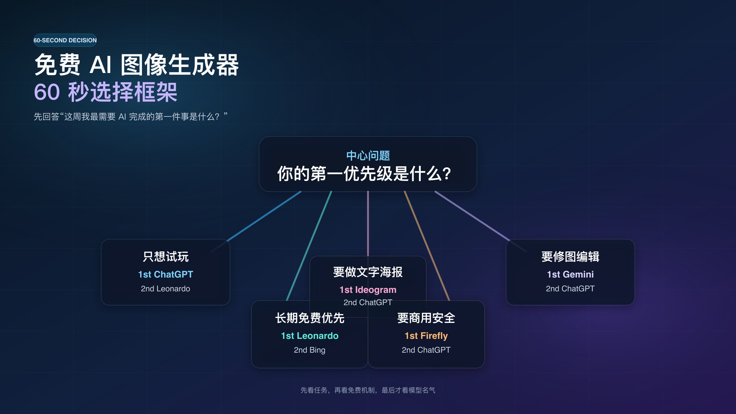 如果你只想要一句直接建议,可以这样理解:先体验综合能力 选 ChatGPT,先做带字海报 选 Ideogram,先做局部修图 看 Gemini,先看商用安全 选 Firefly,先求长期免费 看 Leonardo 或 Bing。真正的问题从来不是谁“理论最强”,而是谁更适合你在接下来两周里高频打开。