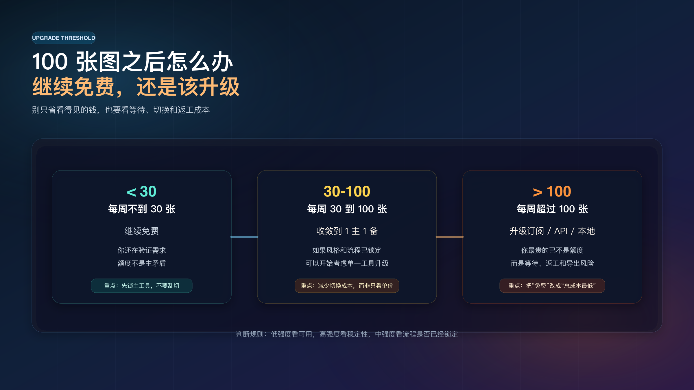 通常不建议把“继续免费”当成唯一目标。到了这个强度,你真正需要的是稳定导出、固定风格、较低返工和批量流程,而不是再多省几次生成额度。更现实的做法,是把本文里的 100 张图试错成本表 当成转折点:低于这个阈值继续免费没问题,高于这个阈值就该开始比较订阅、API 或本地方案。