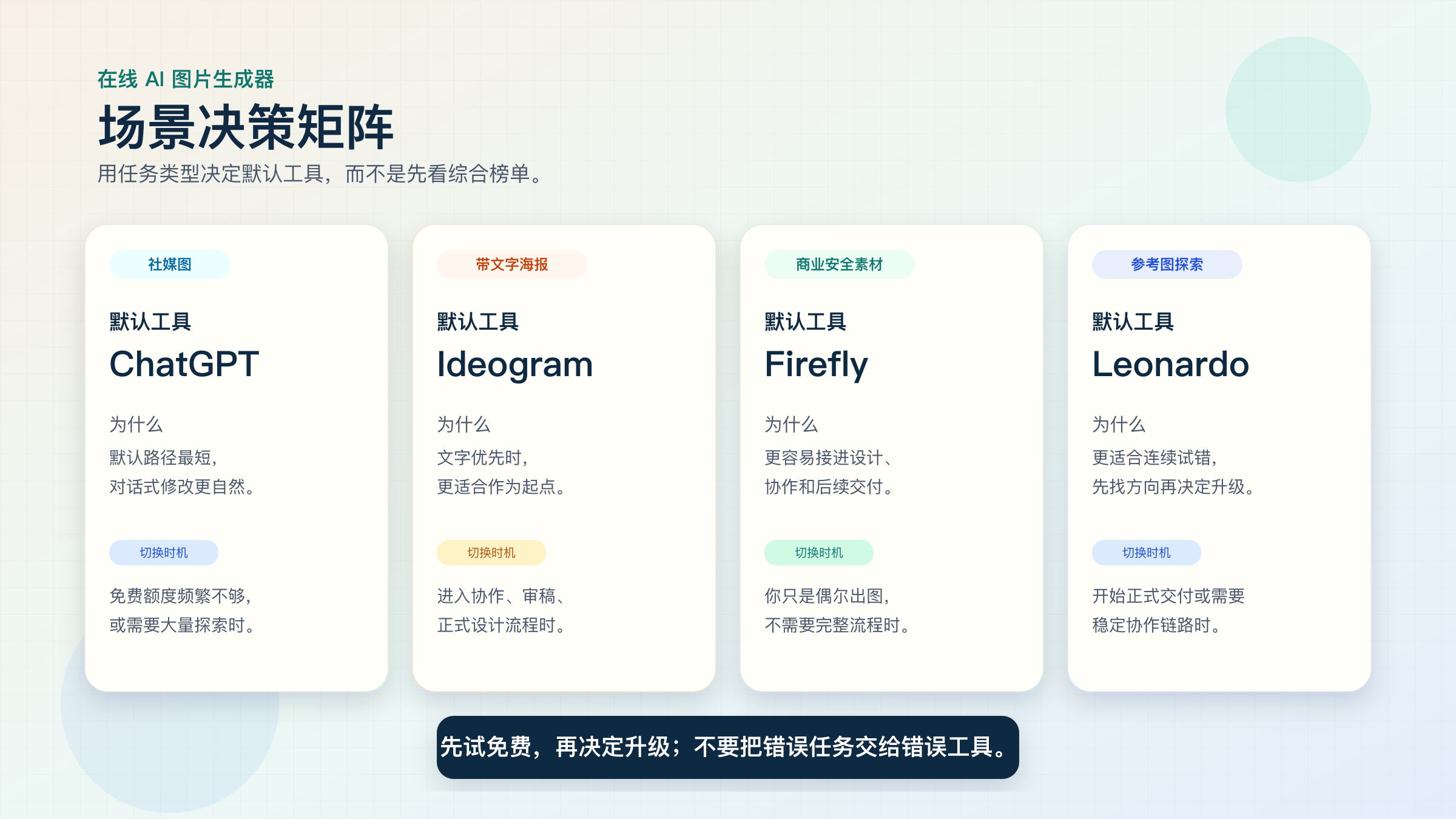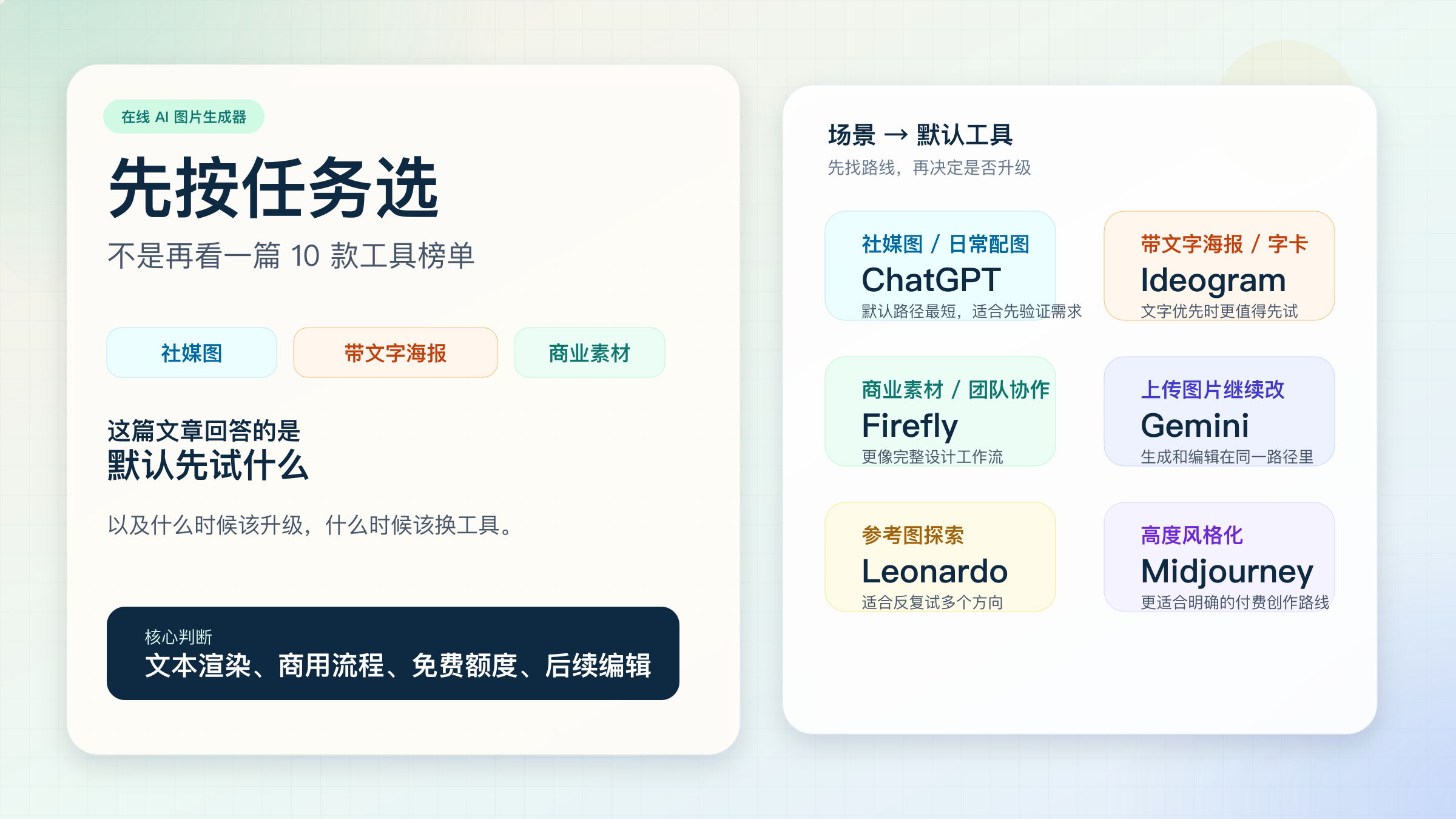 一个很实用的判断法是这样的。只要你最在意“我先把图做出来再说”,就先选默认工具;只要你最在意“图里必须带清晰文字”,就优先走文字图路线;只要你最在意“后面还要进设计、协作和交付”,就先看工作流工具;如果你最在意“我想先试 20 个方向”,那就不要一开始选学习成本和付费门槛都更高的路线。