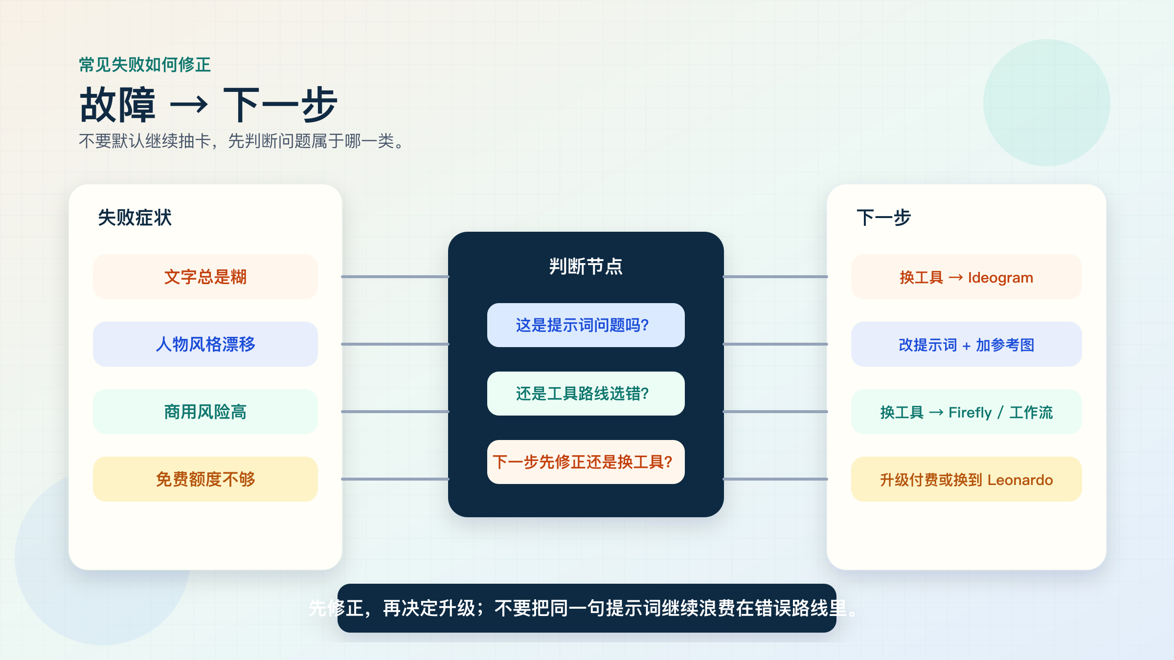 | 文字总是糊或排版不稳 | 工具路线不对,不只是提示词问题 | 先切到 Ideogram 或更适合文字图的路线 |