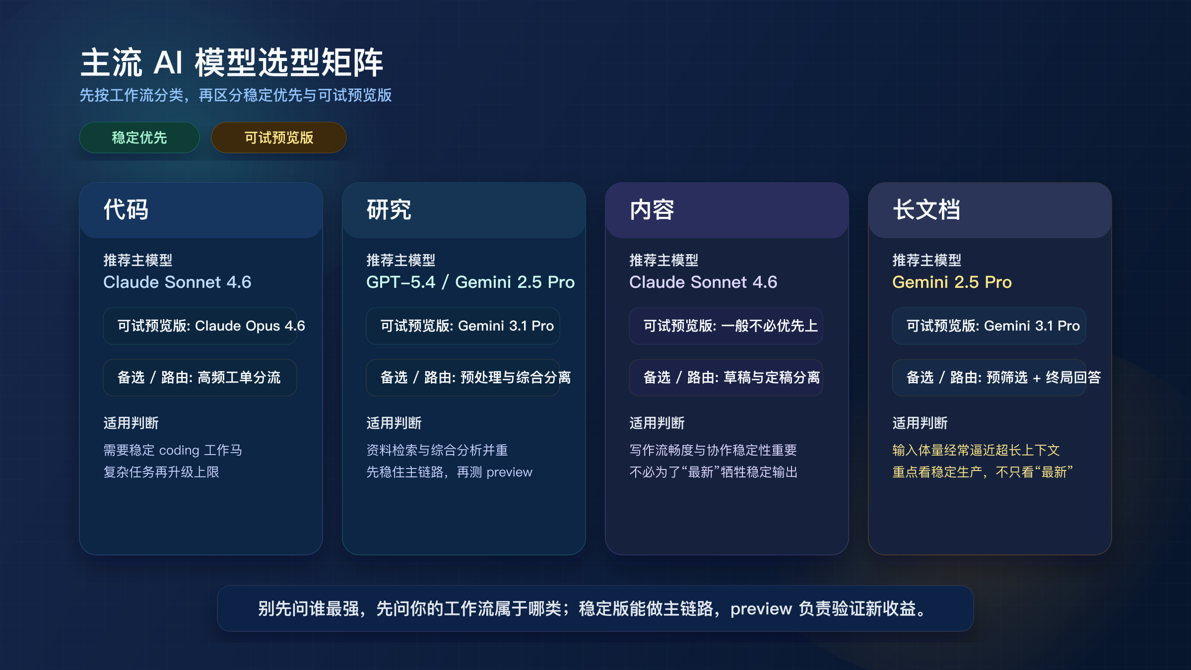 真正能改变选择结果的,不是“某个模型在某个榜单多高 2 分”,而是你的工作流到底属于哪一类。代码代理、研究综合、内容生产和长文档处理,看起来都叫“用 AI”,但在生产里对模型的要求完全不同。