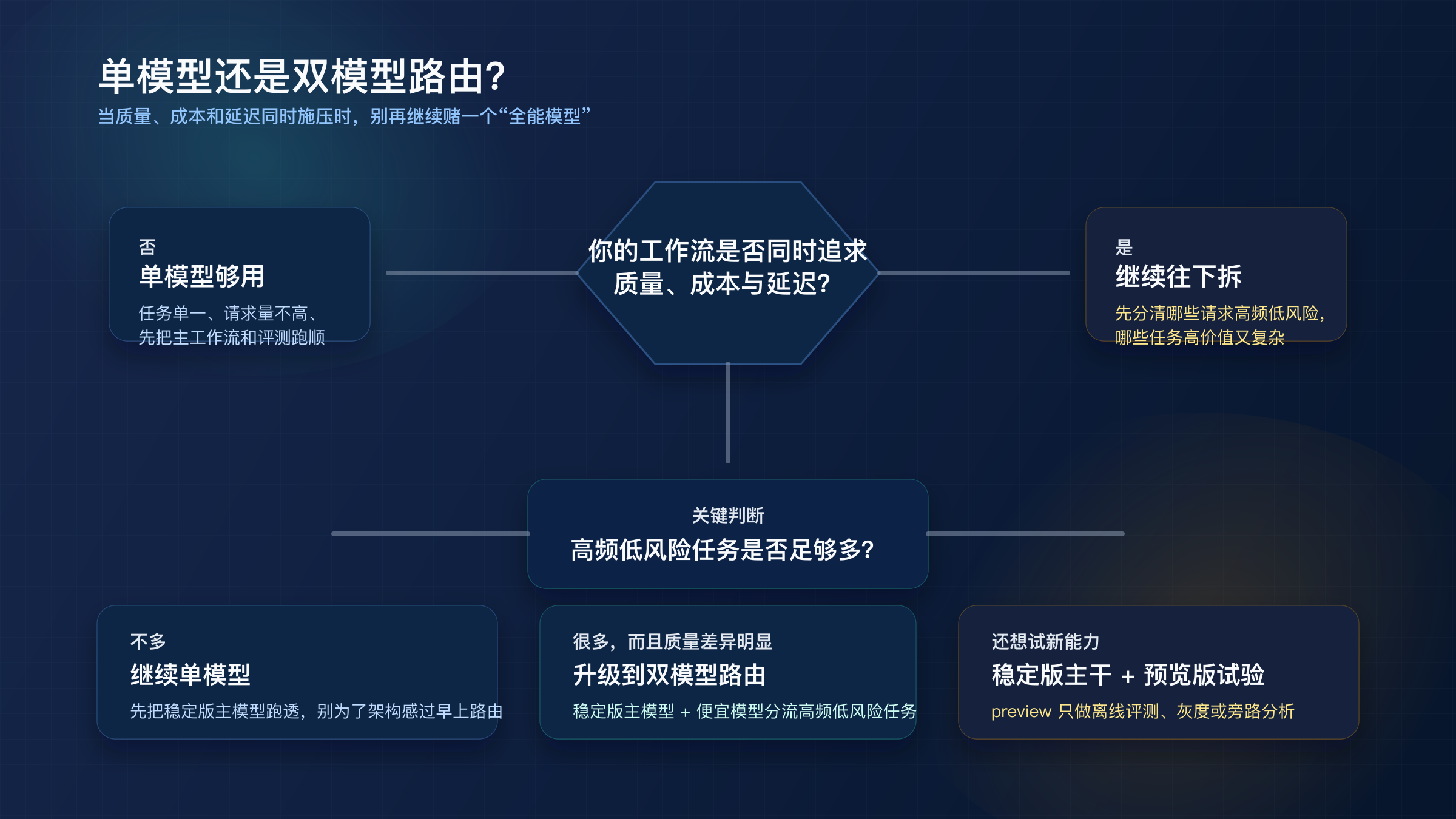 如果你的团队还没有出现这三个信号,单模型通常就够用。很多公司之所以太早做路由,不是因为它真的需要,而是因为它在用“更复杂的架构”掩盖“其实还没弄清主工作流”的问题。把一个稳定工作马跑透,通常比一开始就做三层路由更务实。