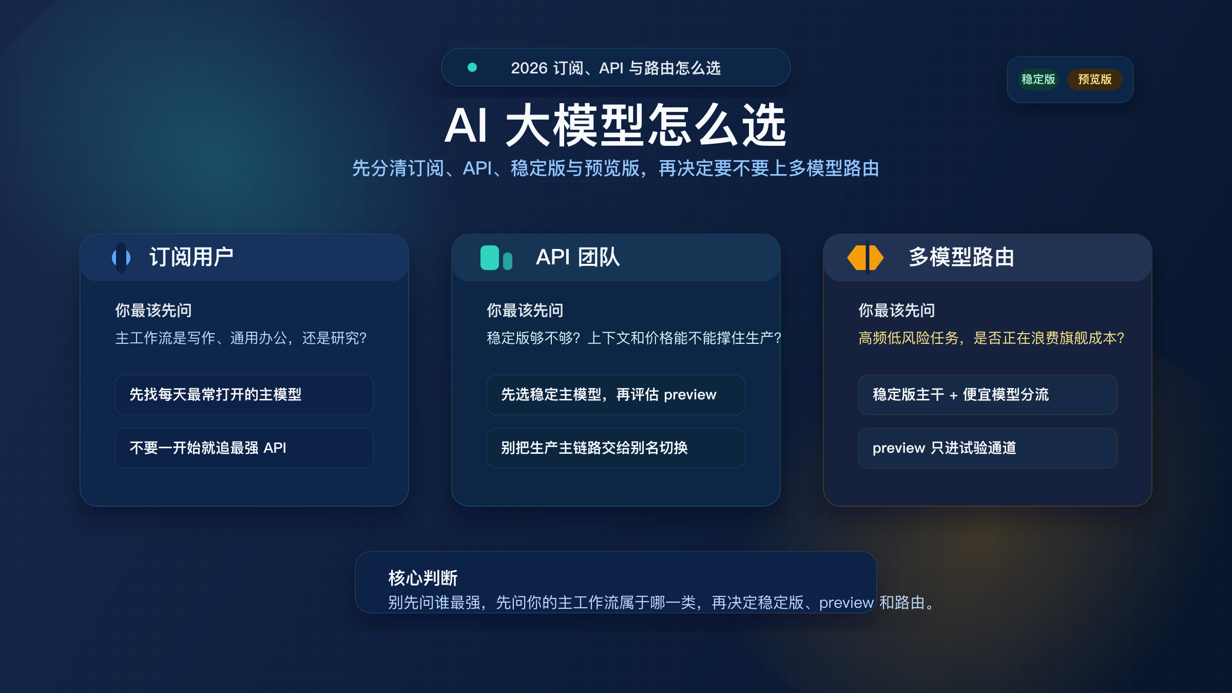 | API 团队 | 稳定版 / 预览版、价格、上下文、延迟 | 先选稳定主模型,再决定是否需要 preview 试验或双模型路由 |