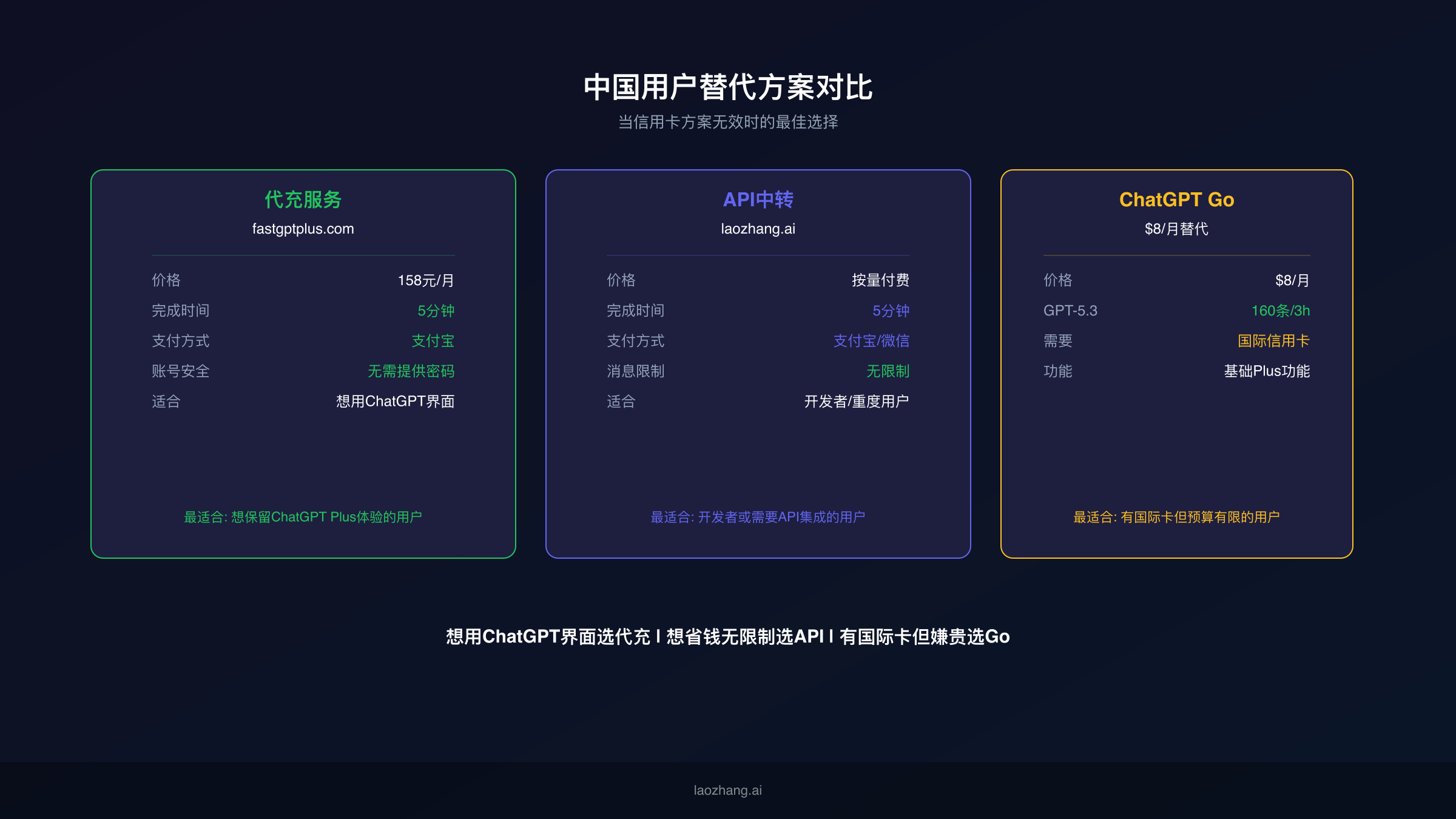 方案三:API中转服务(推荐给开发者和重度用户)。如果你不依赖ChatGPT的网页界面,而是更关注AI模型的使用能力,API方案是成本最低且无任何限制的选择。通过laozhang.ai等中转服务,你可以直接在国内网络环境下调用GPT-5.3、Claude、Gemini等模型,支付宝付款、按量计费、无消息限制。这种方案完全不涉及信用卡问题,注册即可使用。了解更多ChatGPT的使用限制和计划对比,可以参考ChatGPT Plus使用限制完全指南。