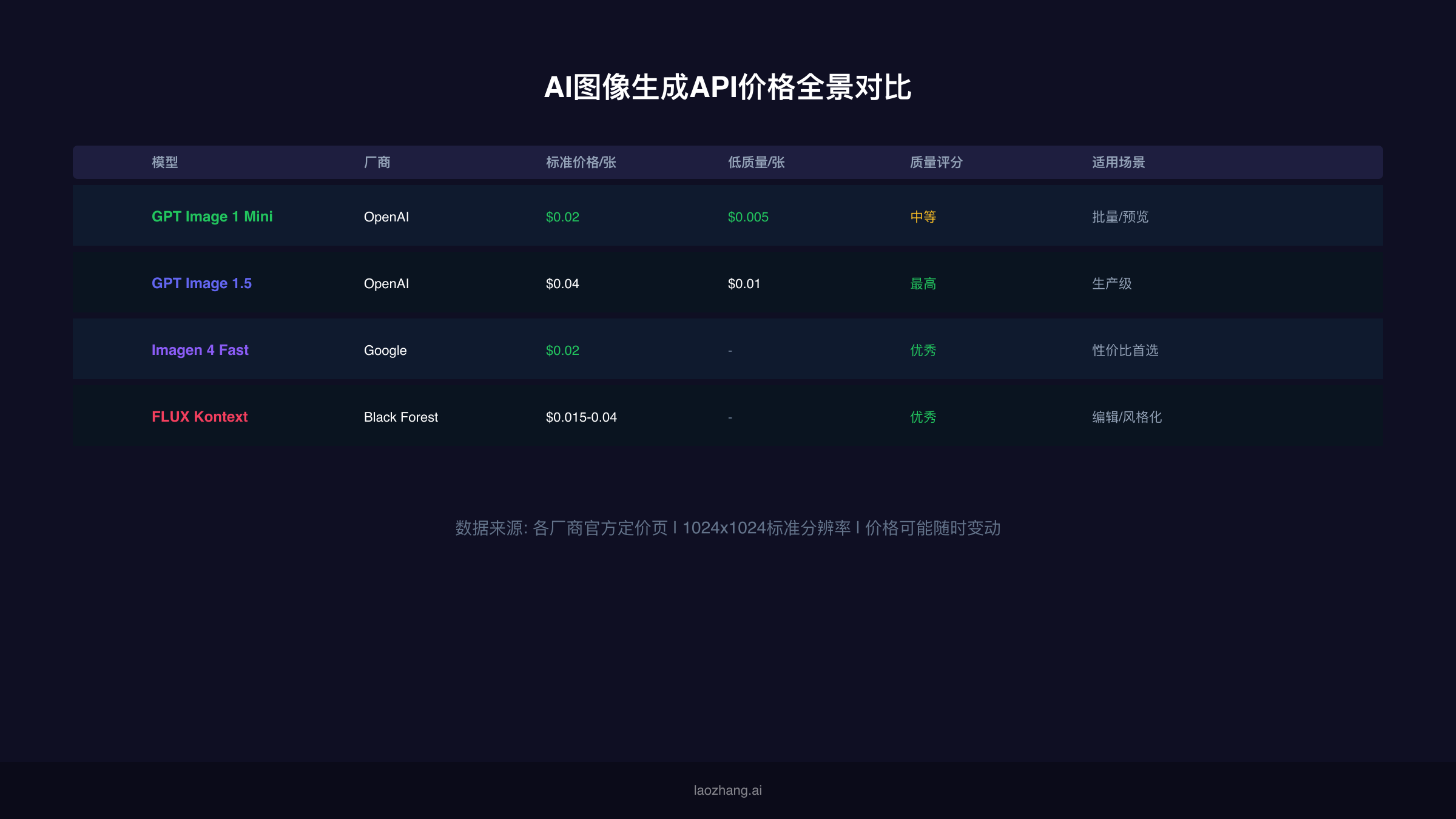 以上定价是各厂商的官方标准价格。对于中国开发者或需要进一步压缩成本的用户,API中转服务提供了额外的优化空间。laozhang.ai等中转服务支持GPT Image、Imagen、FLUX等多个图像模型的调用,通过批量采购的成本优势,API费用通常比直连官方低30-50%。
