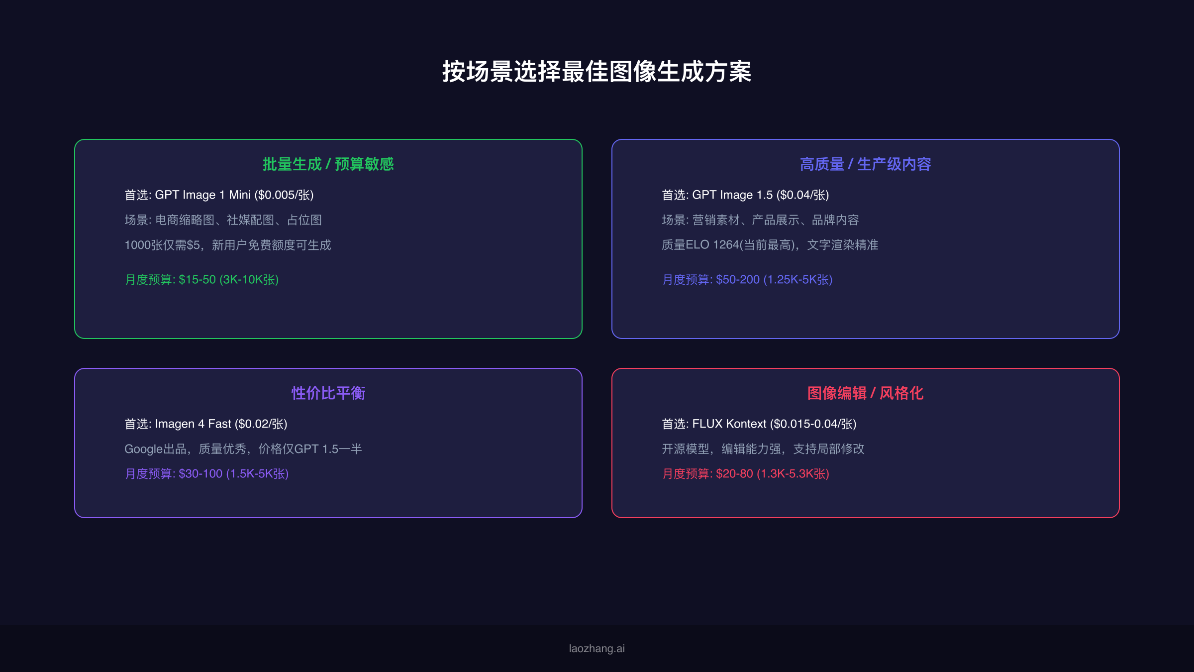 场景三:性价比平衡型应用。大多数应用属于这个类别——需要不错的图像质量,但不需要顶级效果,同时希望控制成本。Imagen 4 Fast($0.02/张)是这个场景的最佳选择,它的质量明显优于GPT Image 1 Mini,价格却只有GPT Image 1.5的一半。对于博客配图、APP内的AI生成图片、教育内容插图等场景,Imagen 4 Fast几乎是完美的平衡点。