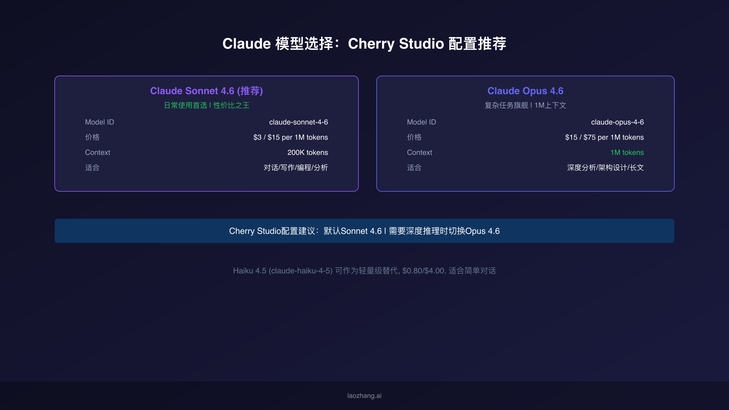 Claude Haiku 4.5(model ID: claude-haiku-4-5)是轻量级选择,价格仅$0.80/$4.00 per 1M tokens。它适合简单对话、快速翻译、格式转换等不需要深度推理的任务。在Cherry Studio中,你可以配置Haiku作为"快速回复"模型,在需要即时响应但不需要高质量输出的场景中使用。