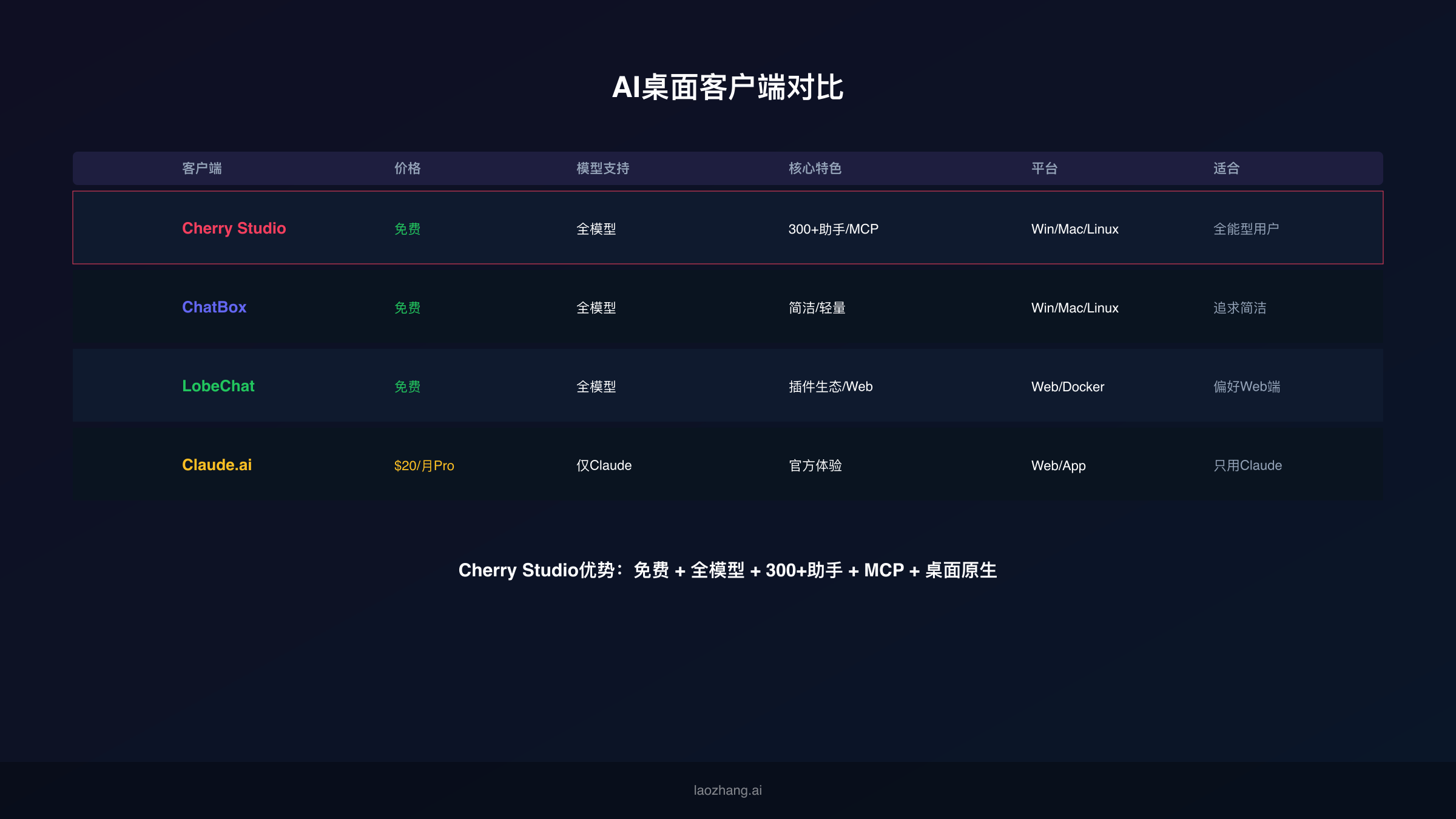 - Cherry Studio:免费开源AI桌面客户端,支持Win/Mac/Linux,300+预配置助手