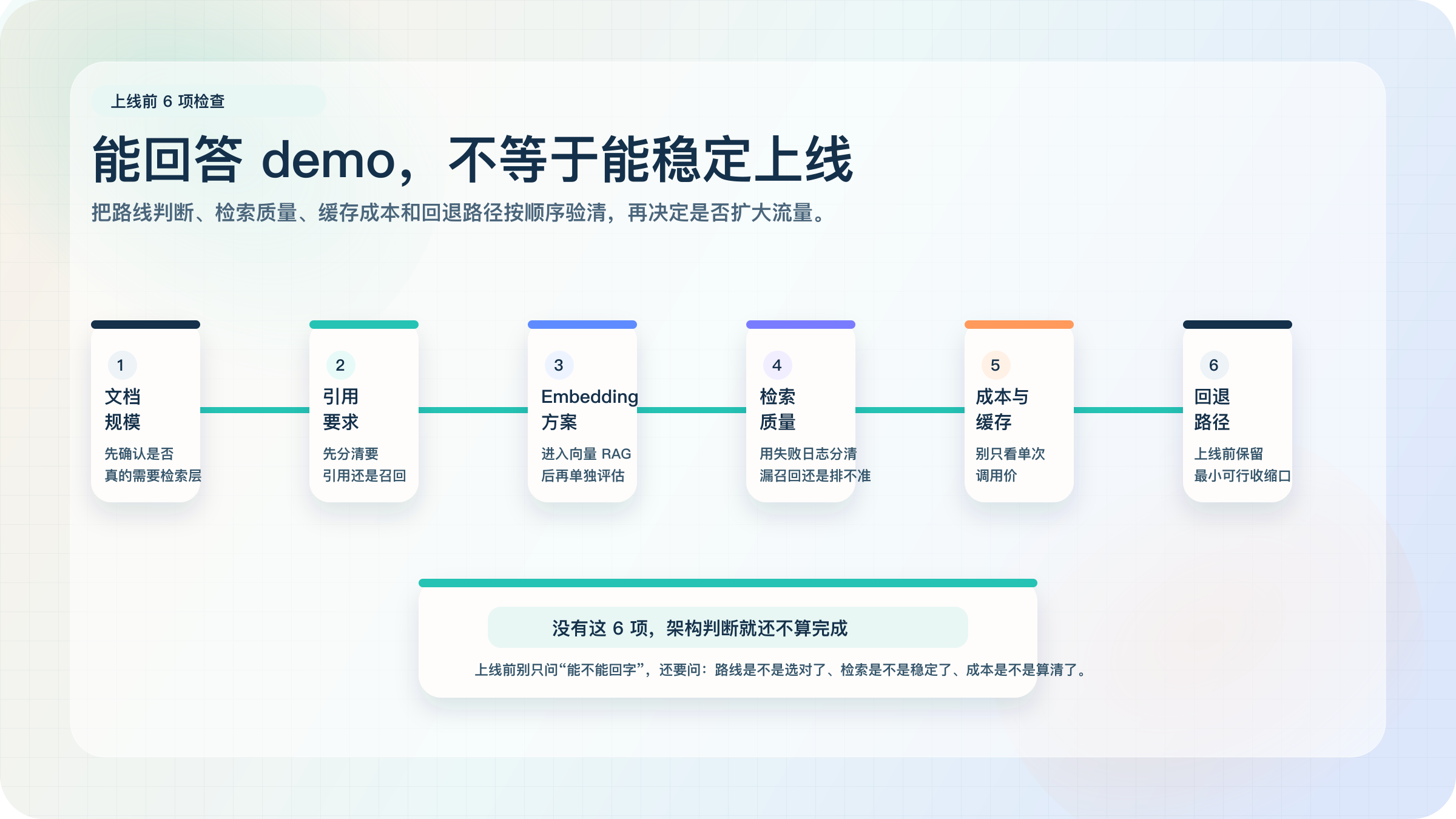 第六,回退路径有没有预先留好。即使你最终决定上聚合层或更重的 RAG 架构,也应该保留一条最小可行的回退入口。真正可上线的系统,不是从不出错的系统,而是出错后仍有收缩路径的系统。