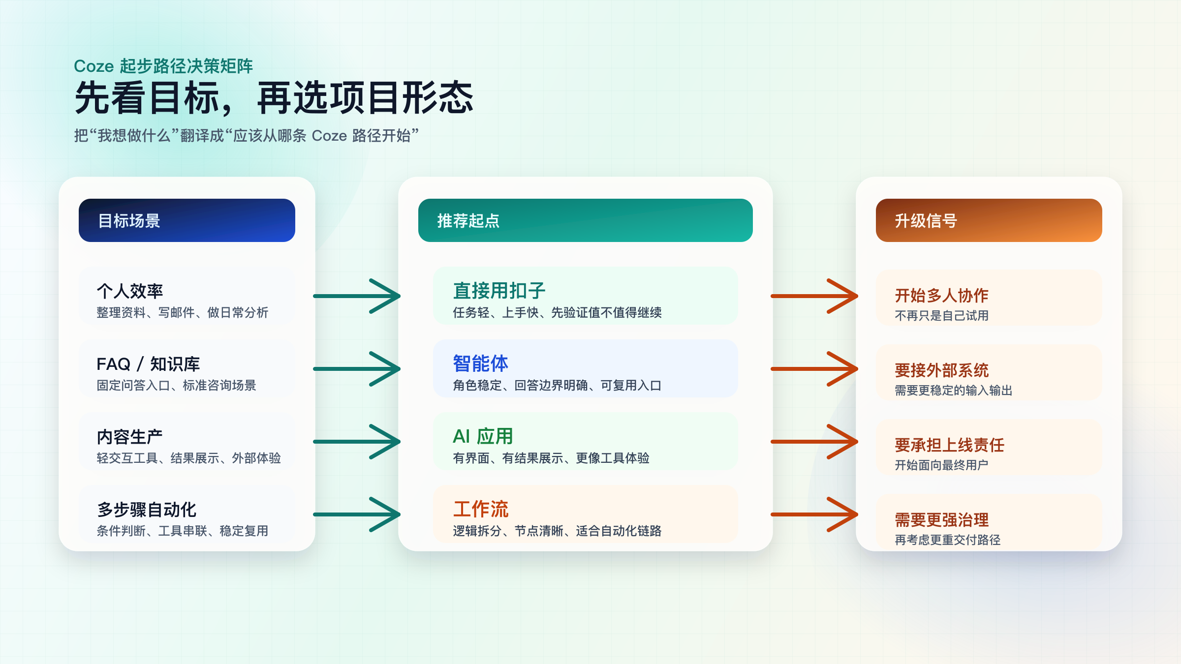 Coze 起步路径决策矩阵:先选对项目形态,再开始搭