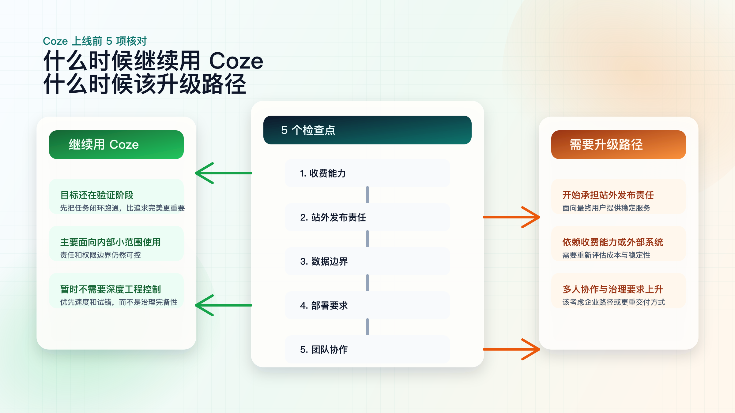 反过来说,如果你目前还停留在个人效率、固定问答、小范围内部试用,并且还没有明显的站外责任、协作治理和深度部署要求,那么继续留在当前 Coze 路径里通常是更划算的。不要因为看到更完整的产品矩阵,就误以为自己必须把所有路径都补齐。真正成熟的判断,永远是只在升级信号已经出现时才升级。