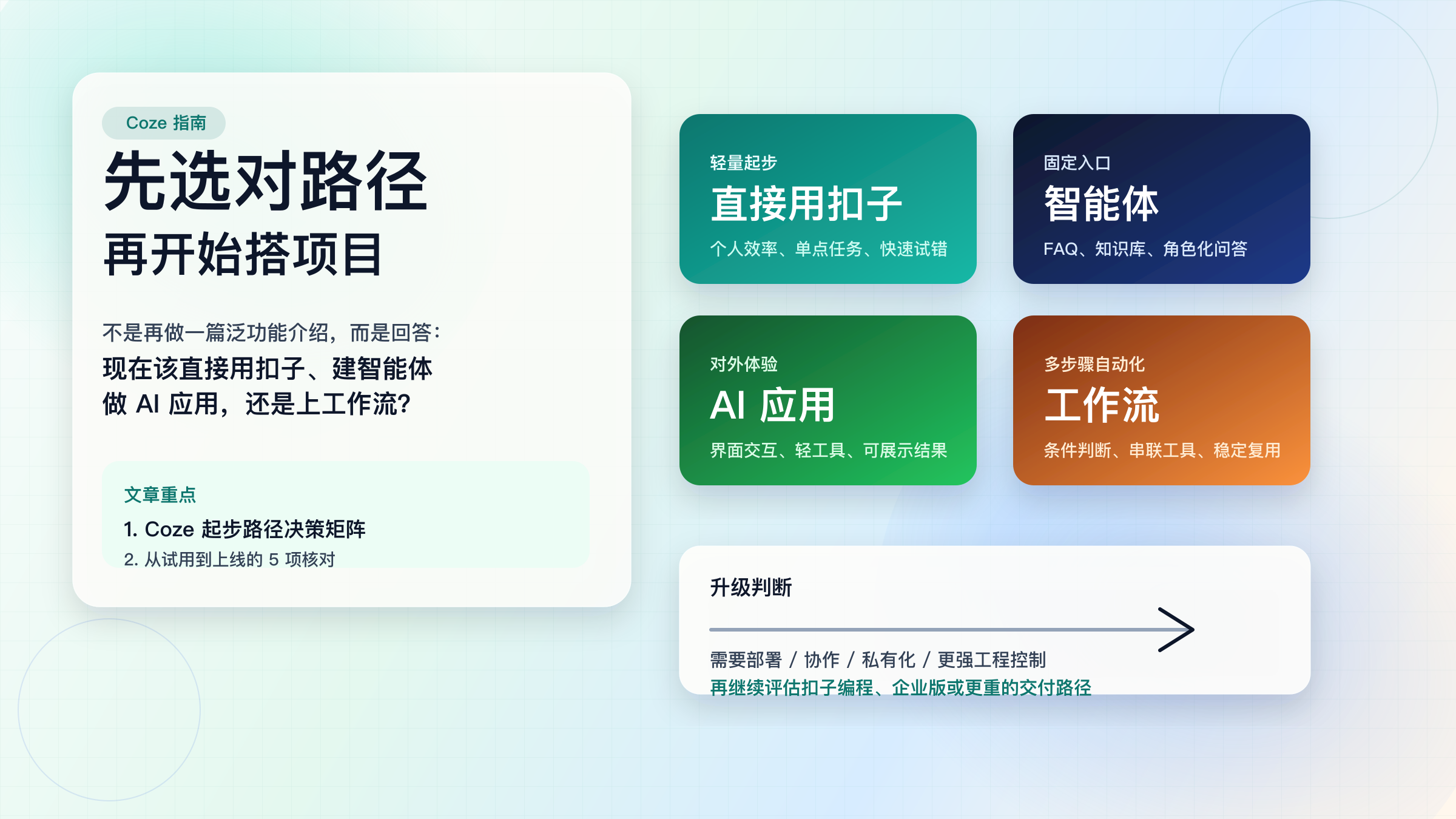 今天再看 Coze,真正重要的已经不是“它能不能做知识库、插件、工作流”,而是你有没有先选对起步路径。直接用扣子、建智能体、做 AI 应用、上工作流、再到更重的开发与企业路径,本质上不是功能列表,而是一组越来越接近真实交付的容器。