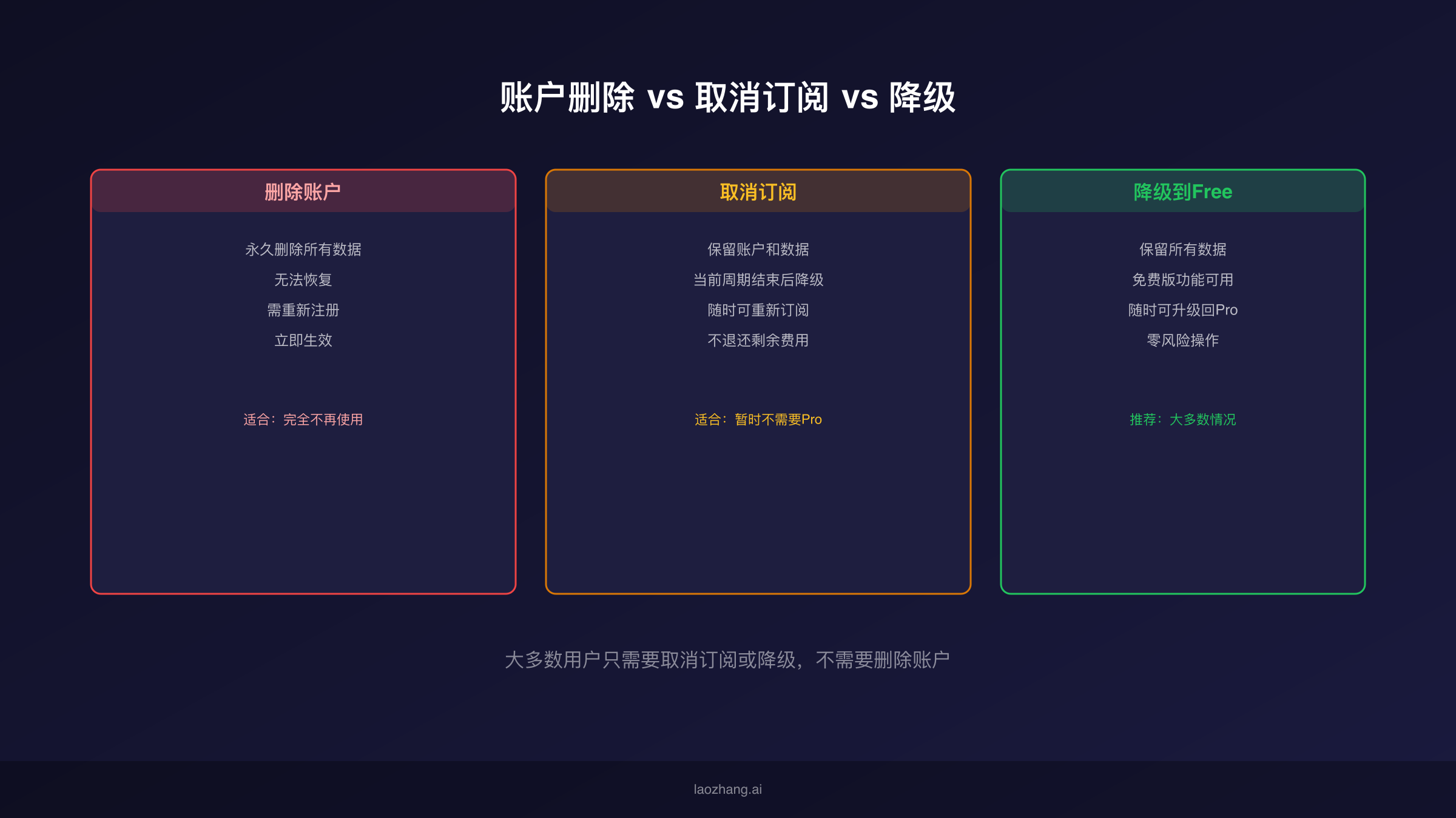 | 取消订阅 | 全部保留 | 完全可逆 | 暂停付费、评估是否继续 |
