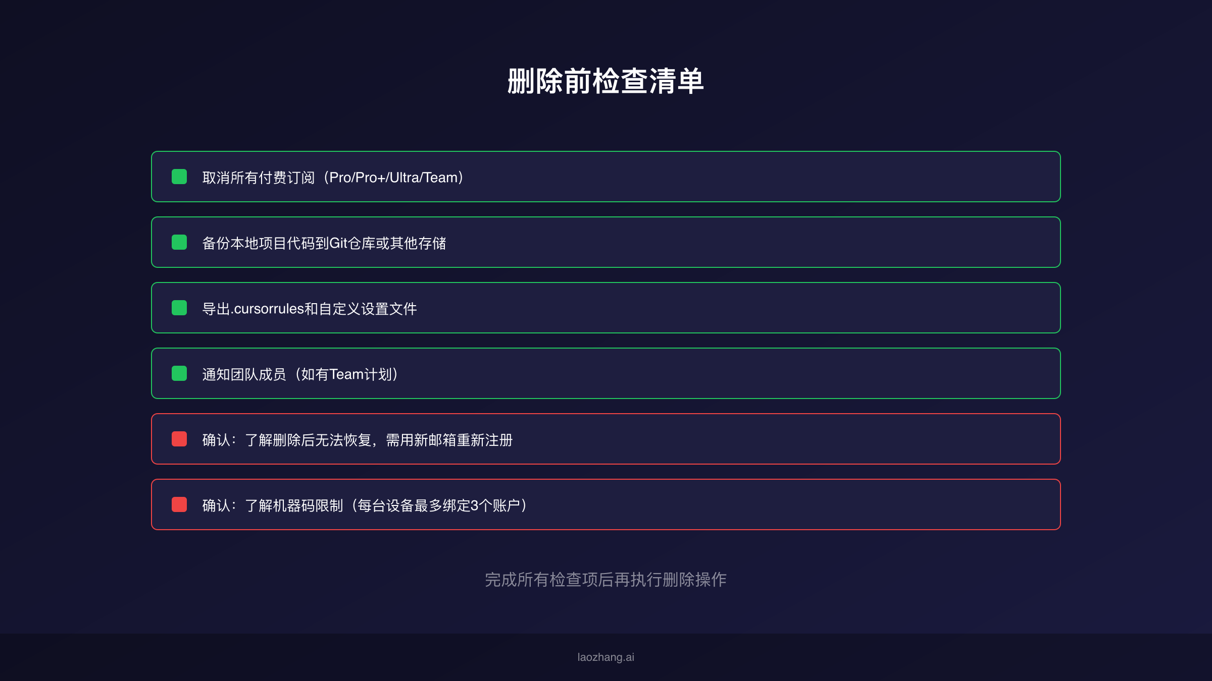 详解Cursor账户删除的完整步骤、订阅取消方法、数据备份要点和机器码限制。包含删除vs取消订阅vs降级的对比分析,帮你选择最合适的方案。