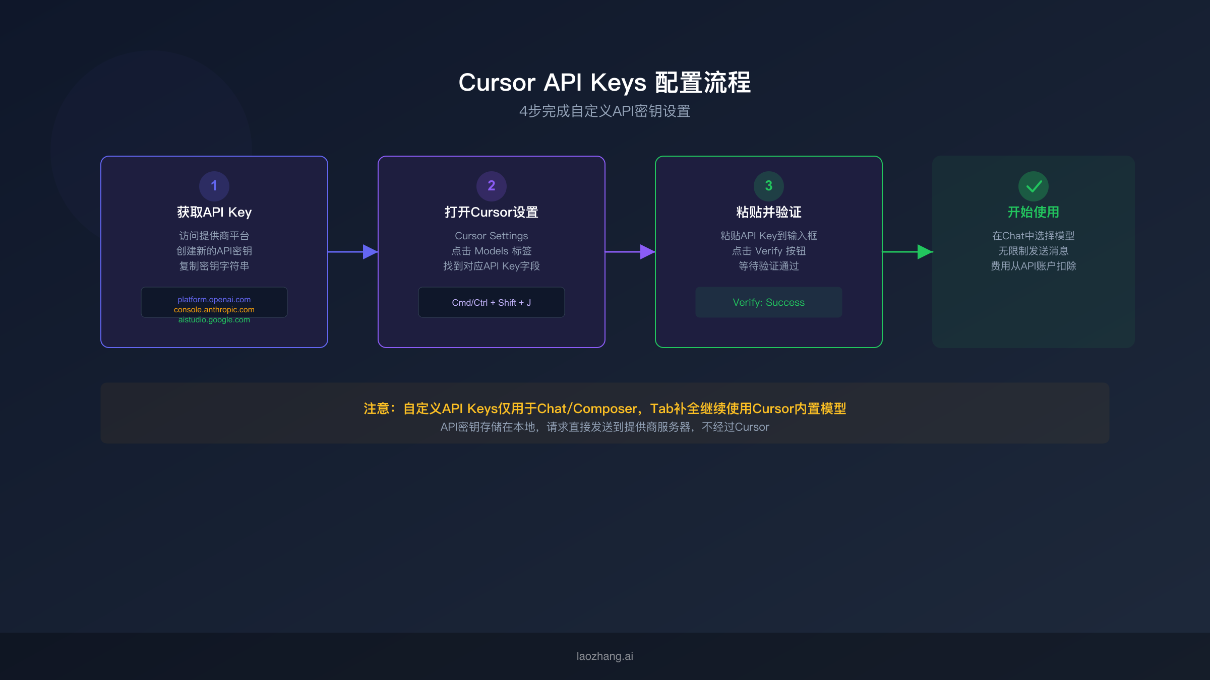 整个配置过程分为三个阶段:获取API密钥、在Cursor中输入密钥、验证并开始使用。以下以最常用的OpenAI和Anthropic为例,提供详细的操作步骤。