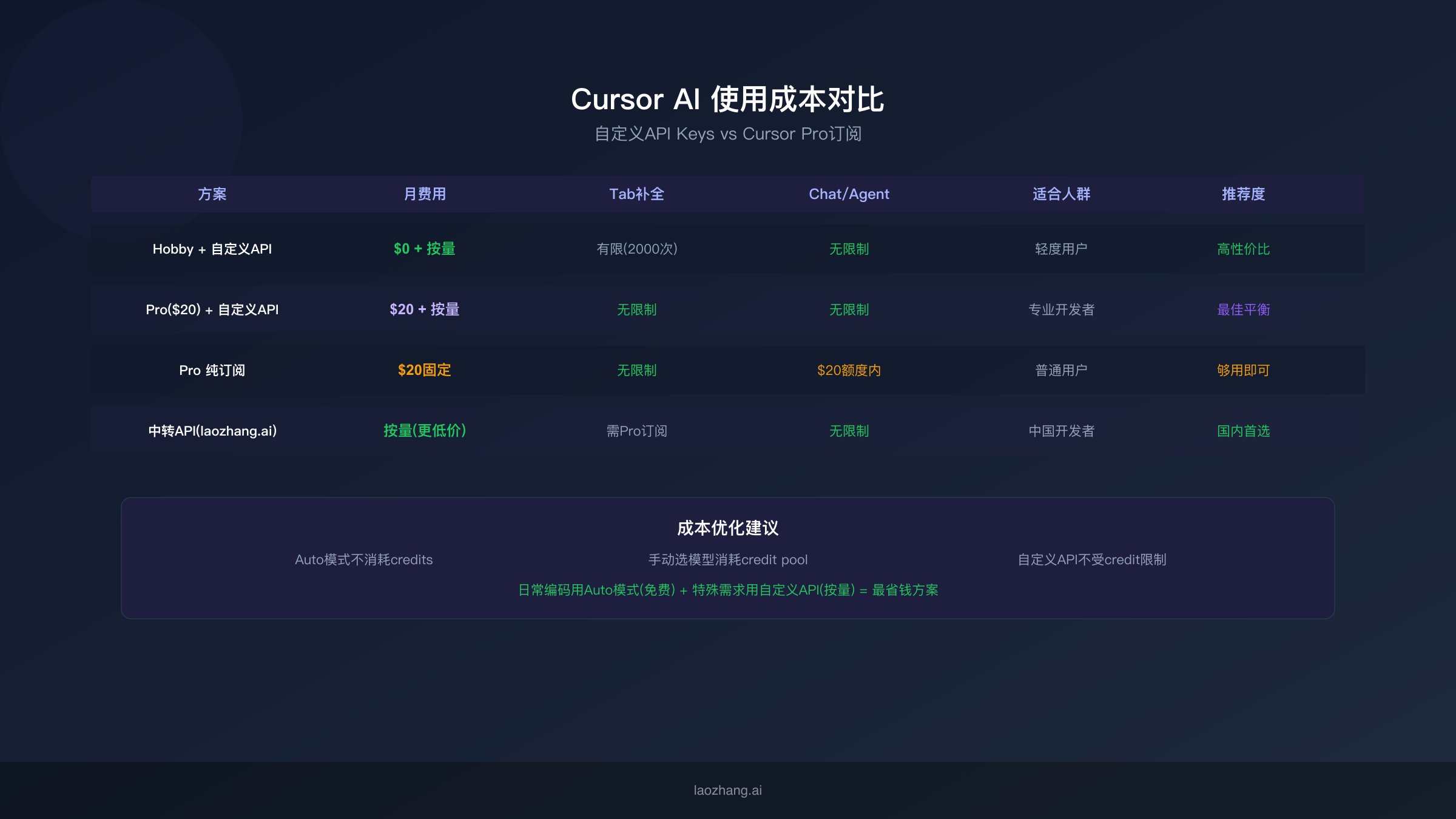 需要注意的是,自定义API Keys并不能替代Cursor Pro订阅的全部价值。Cursor Pro提供的无限Tab补全功能依然需要订阅才能获得,自定义API Keys仅适用于Chat、Composer和Agent功能。对于大多数开发者来说,最佳方案是Cursor Pro订阅(获得无限Tab补全)搭配自定义API Keys(获得无限Chat/Agent使用),关于Cursor各版本定价的详细对比可以参考Cursor定价完全指南。