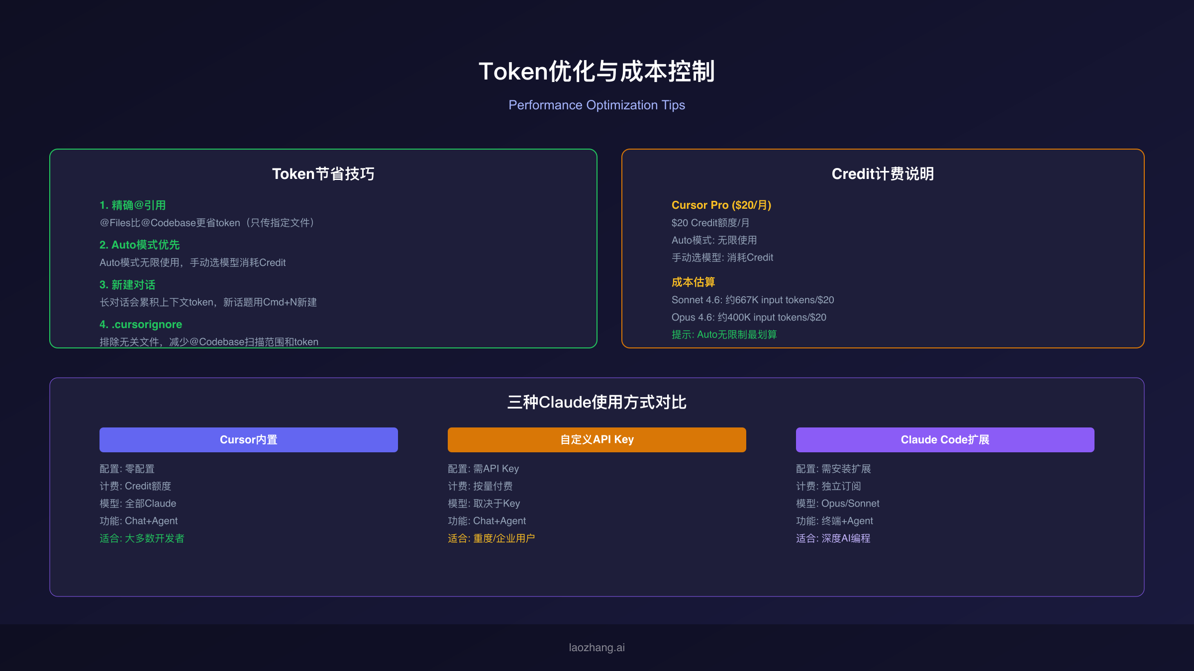 详解在Cursor中使用Claude的三种方式(内置模型、自定义API Key、Claude Code扩展),包含Sonnet 4.6/Opus 4.6模型对比、Auto模式策略、token优化技巧。基于Cursor v2.6最新版本。