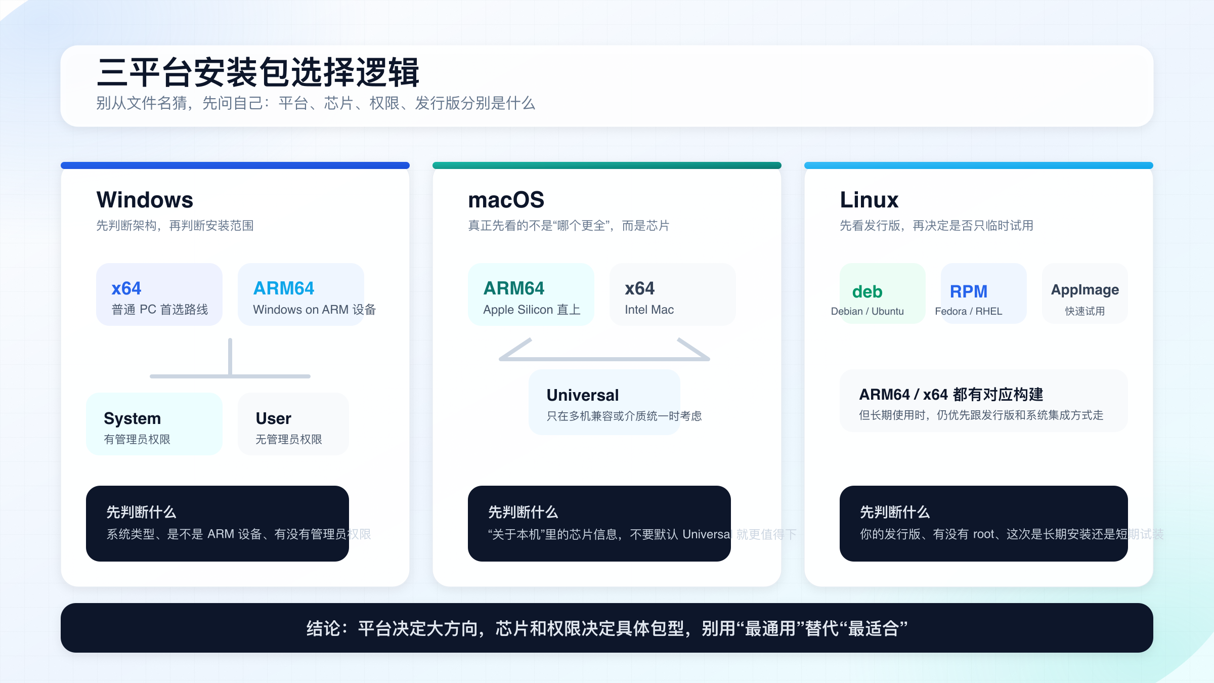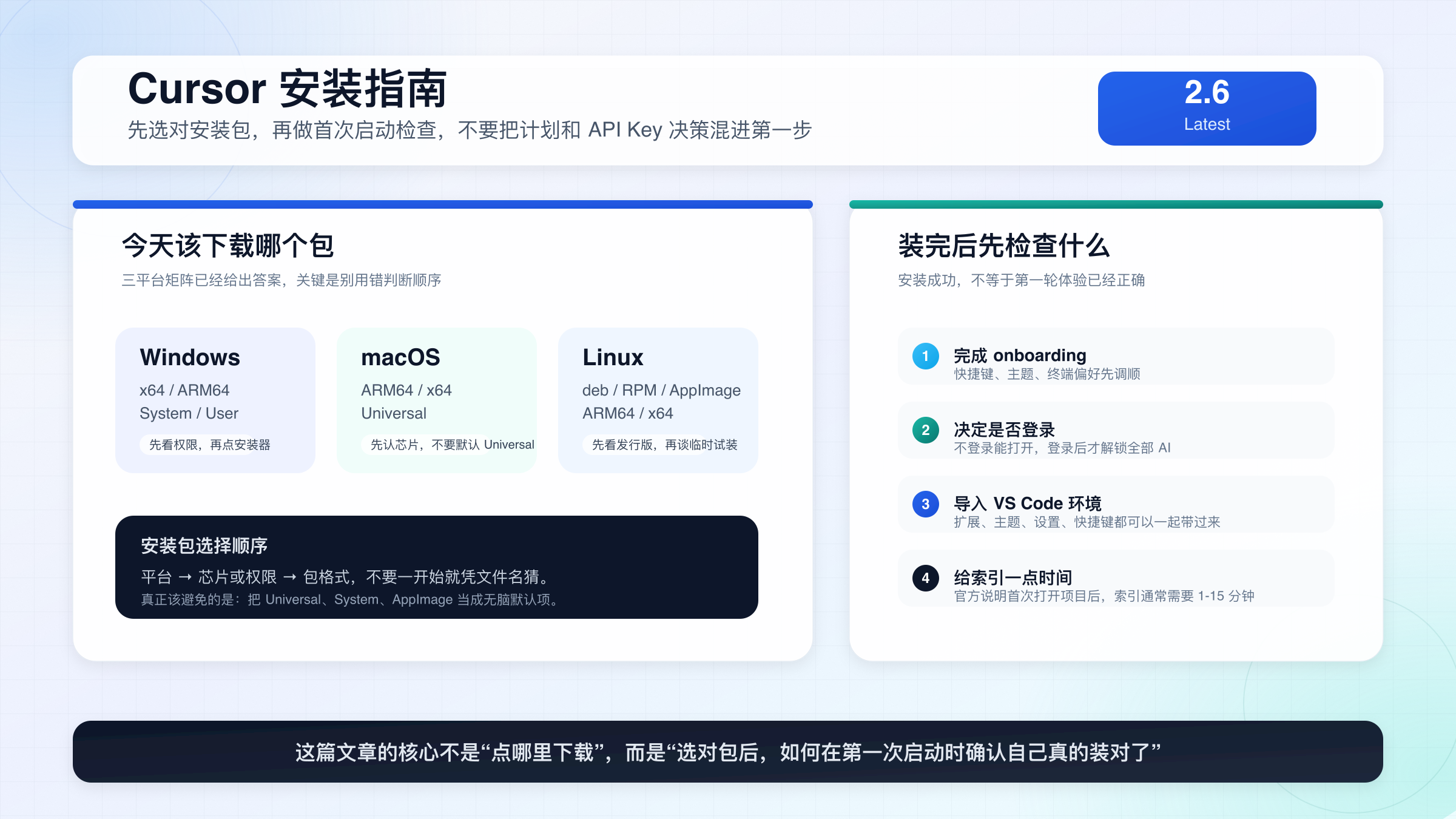 如果你只记一个顺序,记这个就够了:先看芯片,再看权限,最后看包格式。 很多安装问题不是因为 Cursor “难装”,而是因为用户一开始就把 Universal、System 或 AppImage 当成了万能默认项。它们都不是万能,只是服务于不同环境的折中选项。