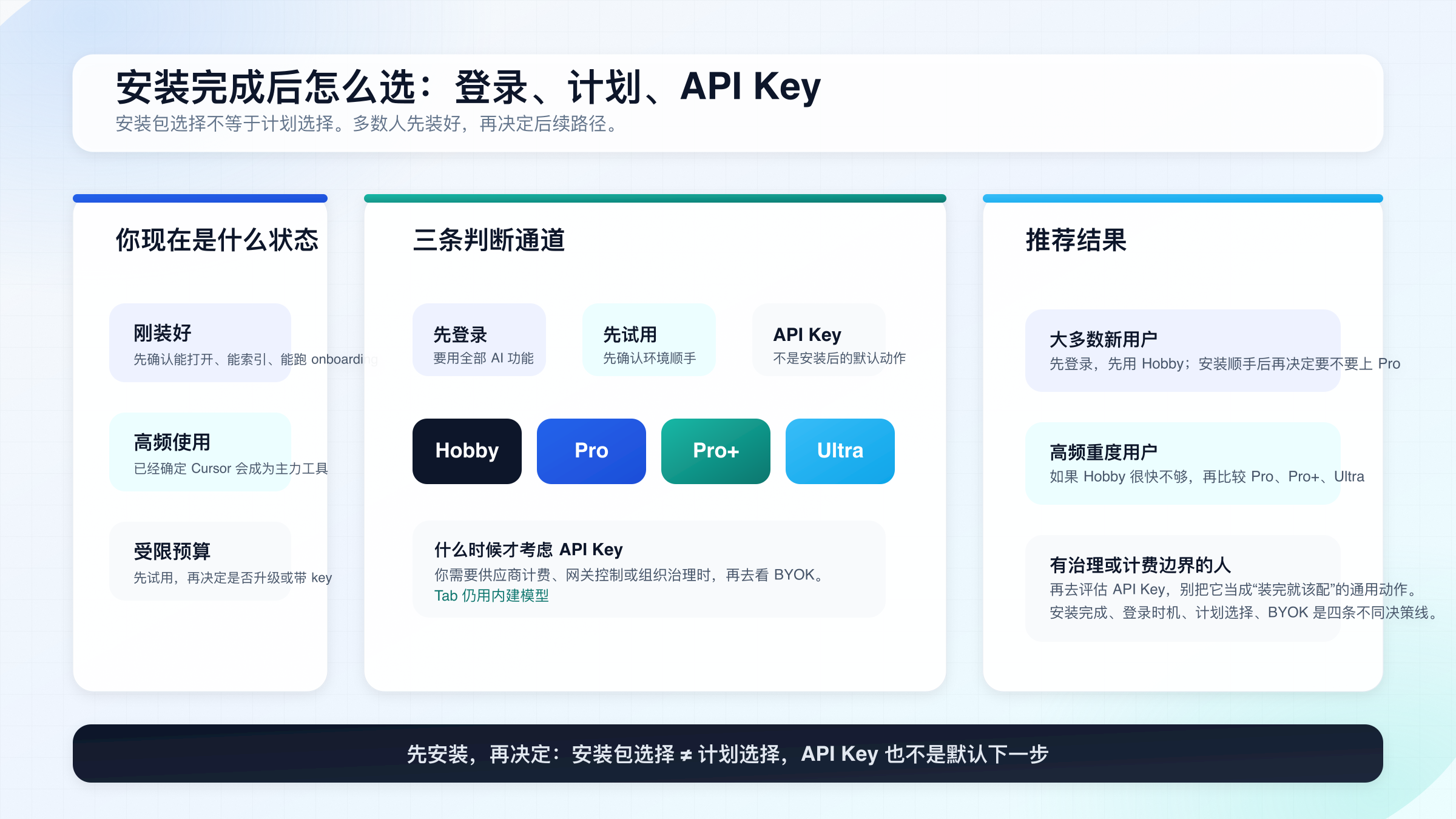 如果你只想记住一句话,请记住这句:Cursor 安装这件事,先解决“包选对没有”,再解决“登录和计划怎么选”,最后才是 API Key 和更深的工作流配置。 顺序理顺了,安装这一步其实远没有很多旧教程写得那么复杂。