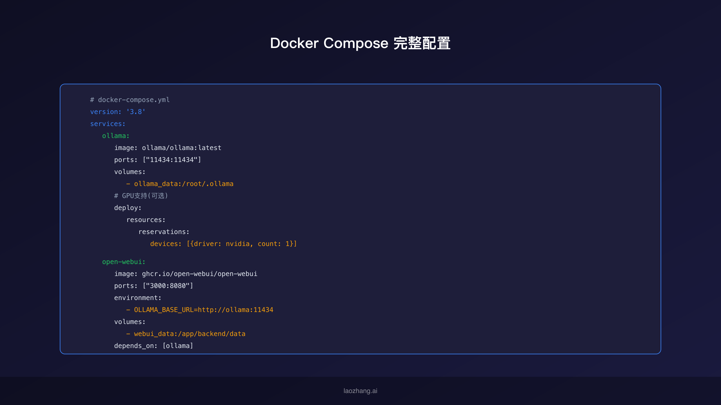 docker-compose.yml文件同时启动Ollama和Open WebUI,自动配置网络连接和数据持久化
