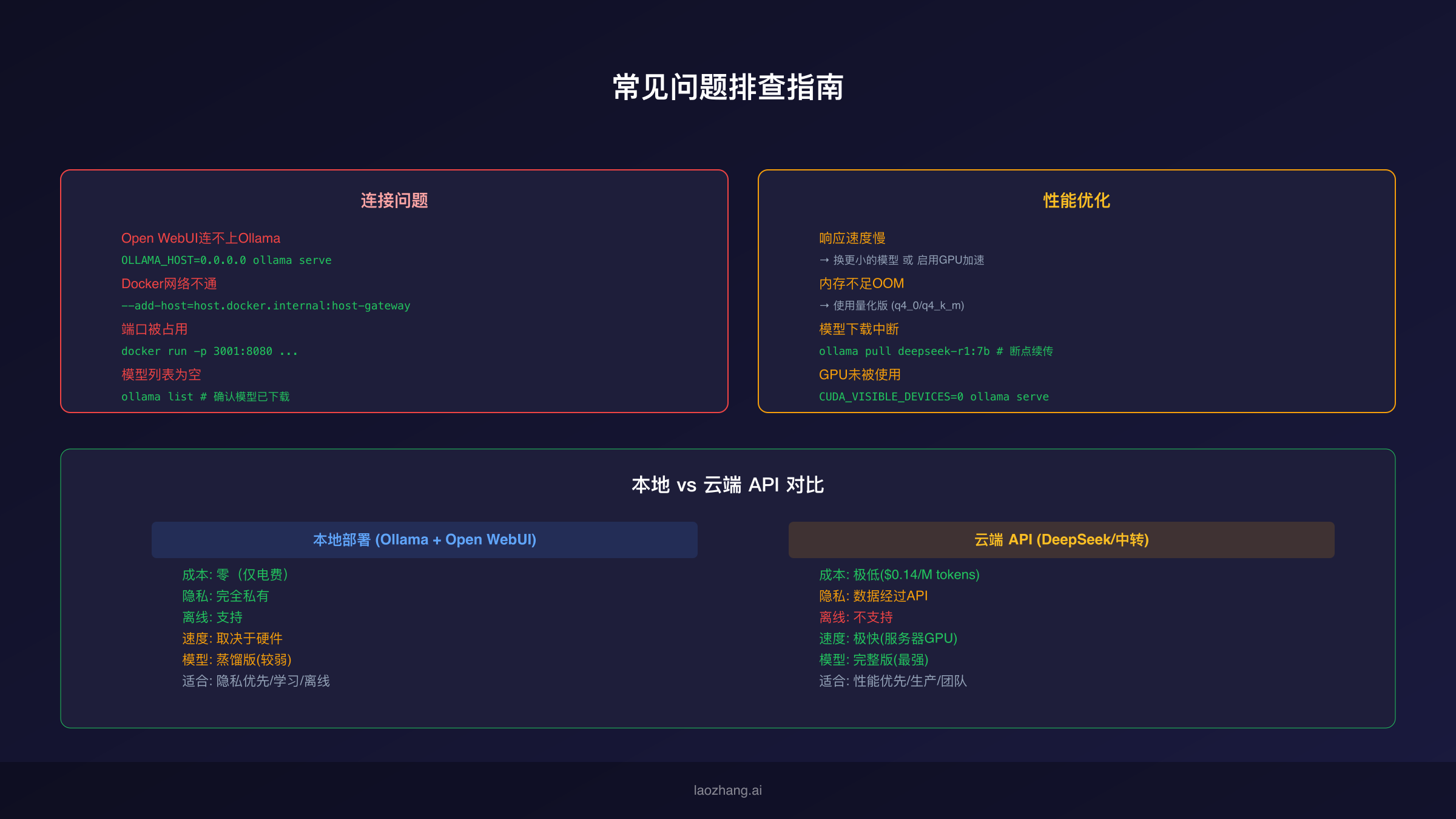 **内存不足(OOM)**意味着模型对你的硬件来说太大了。解决方案是换更小的模型,或者使用更激进的量化版本。运行ollama show deepseek-r1:7b可以查看模型的具体参数和内存需求。如果你需要在有限内存中运行更大的模型,可以通过设置OLLAMA_NUM_PARALLEL=1限制并发请求数来减少内存占用。