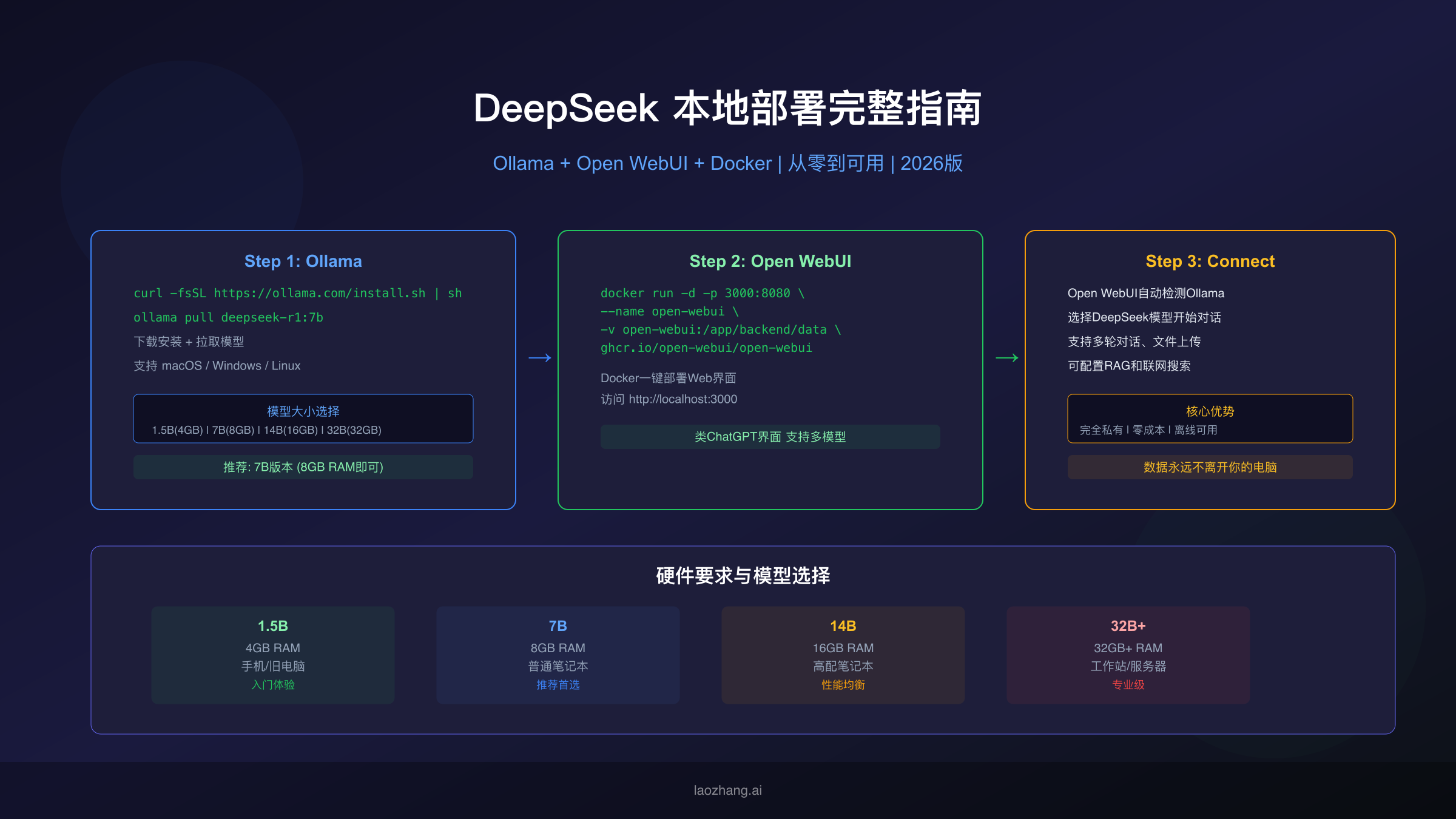 curl -fsSL https://ollama.com/install.sh | sh)→ 拉取DeepSeek模型(ollama pull deepseek-r1:7b)→ Docker启动Open WebUI → 访问localhost:3000开始对话 - 硬件要求灵活:1.5B版本只需4GB RAM(旧电脑可用),7B版本需8GB RAM(推荐首选),14B需16GB,32B需32GB——根据你的硬件选择合适的模型大小