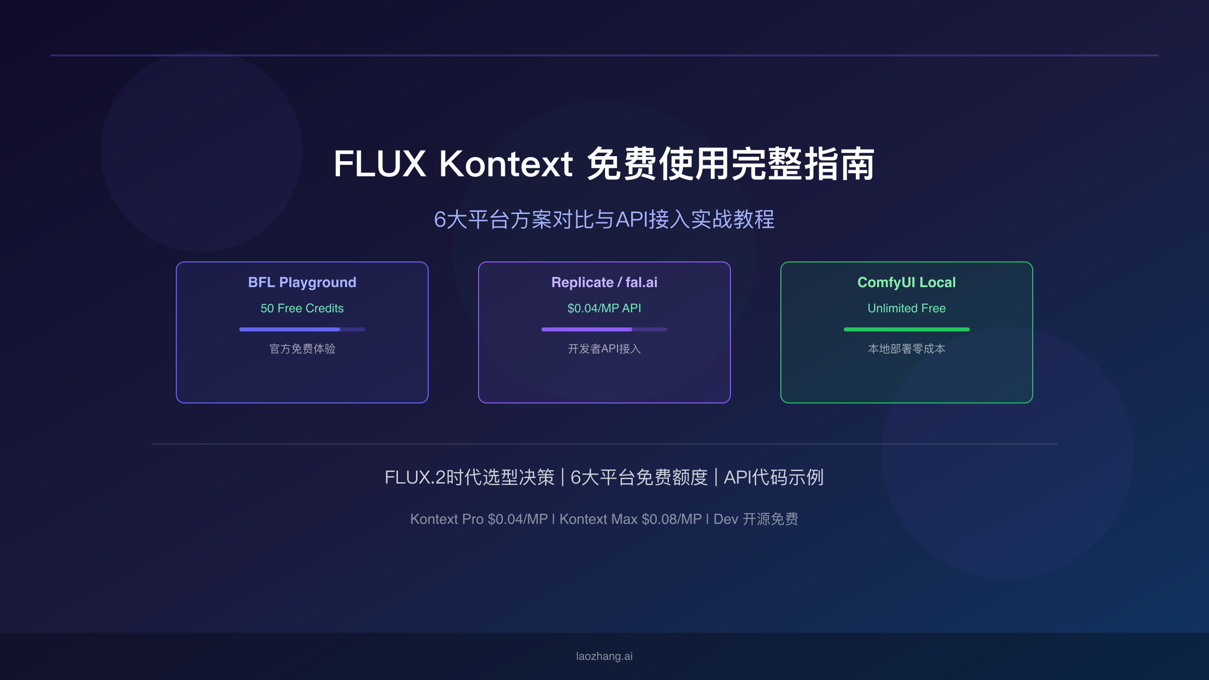 - 6大平台提供免费使用:BFL官方Playground(50积分)、Replicate(有限免费试用)、fal.ai(新用户赠送额度)、Together AI(创业积分计划)、ComfyUI本地部署(完全免费)、在线工具平台(每日限量)