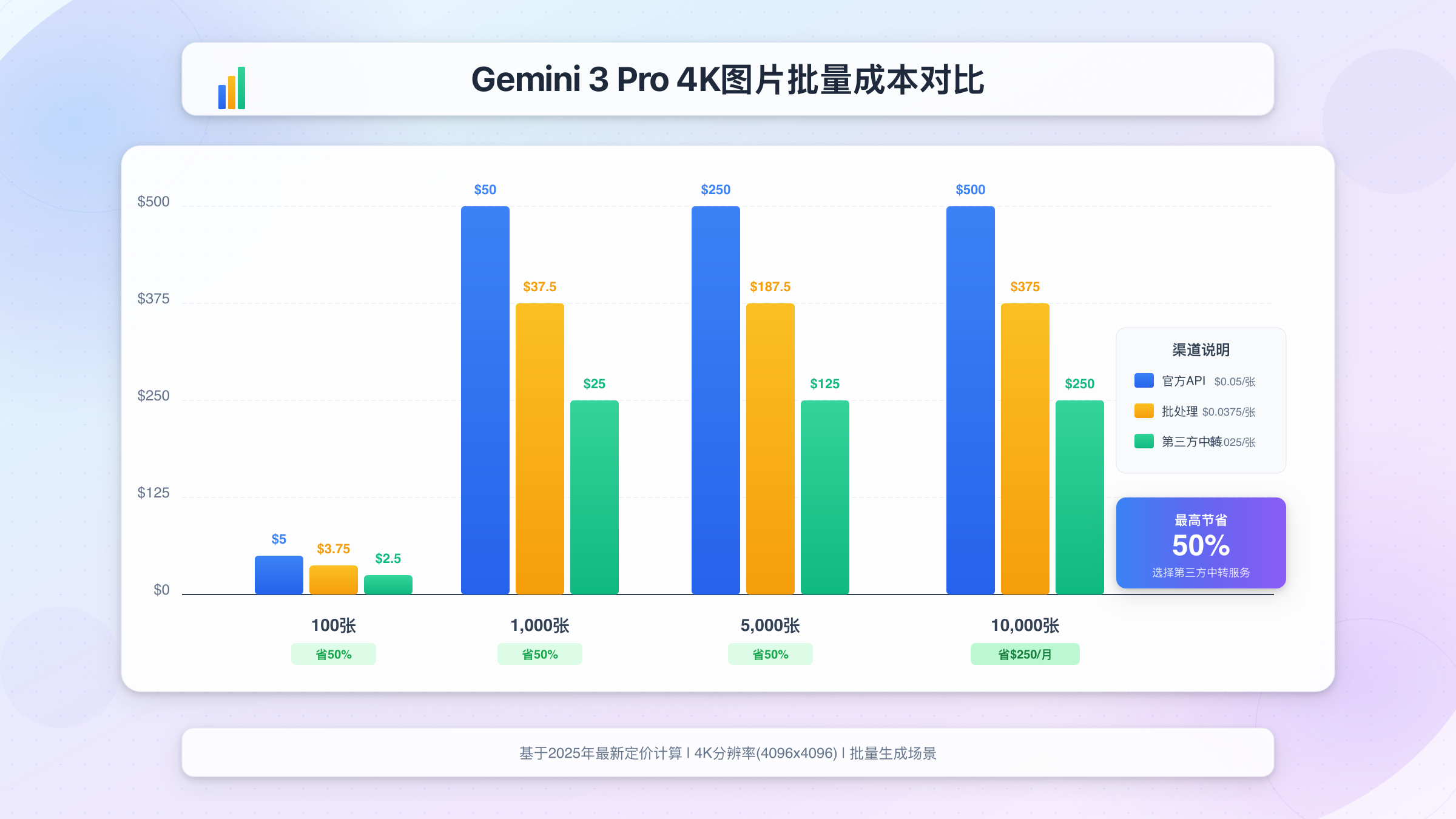但令人意外的是,市场上存在着巨大的价格差异。同样是调用Gemini 3 Pro生成4K图片,通过Google官方的批处理API只需**$0.12/张**(50%折扣),而一些可靠的第三方中转服务甚至可以做到**$0.05/张**——仅为官方标准价的21%。
