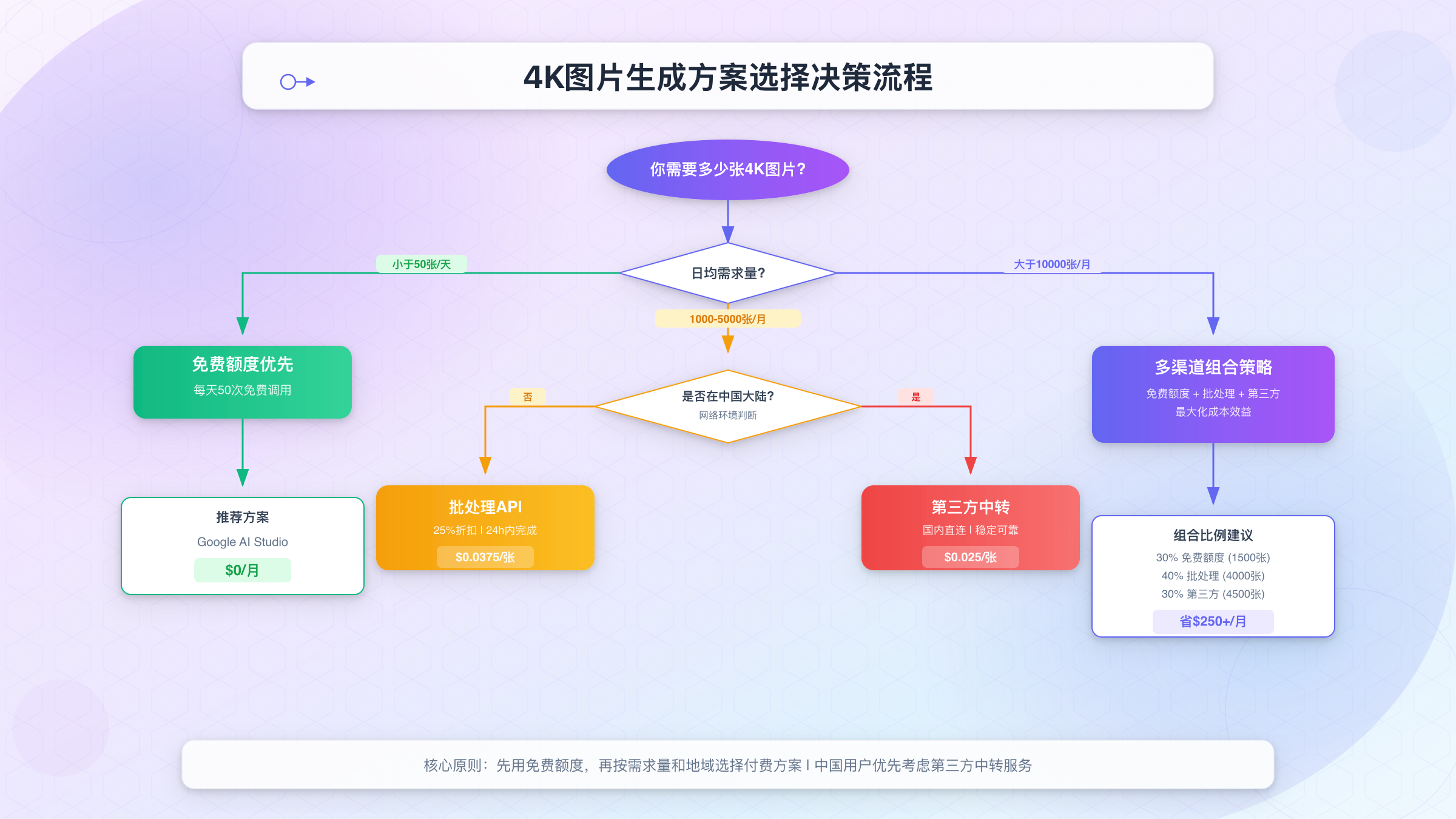 对于小批量需求(每月100-500张),选择空间相对灵活。如果你能够分散在多天完成生成任务,充分利用免费额度,实际成本可以控制在零。假设每天生成30张4K图片,一个月就是900张,完全在免费范围内。对于急需一次性完成的情况,官方API的成本约为$24-120(100-500张×$0.24),而通过批处理可降至$12-60,第三方服务则只需$5-40。