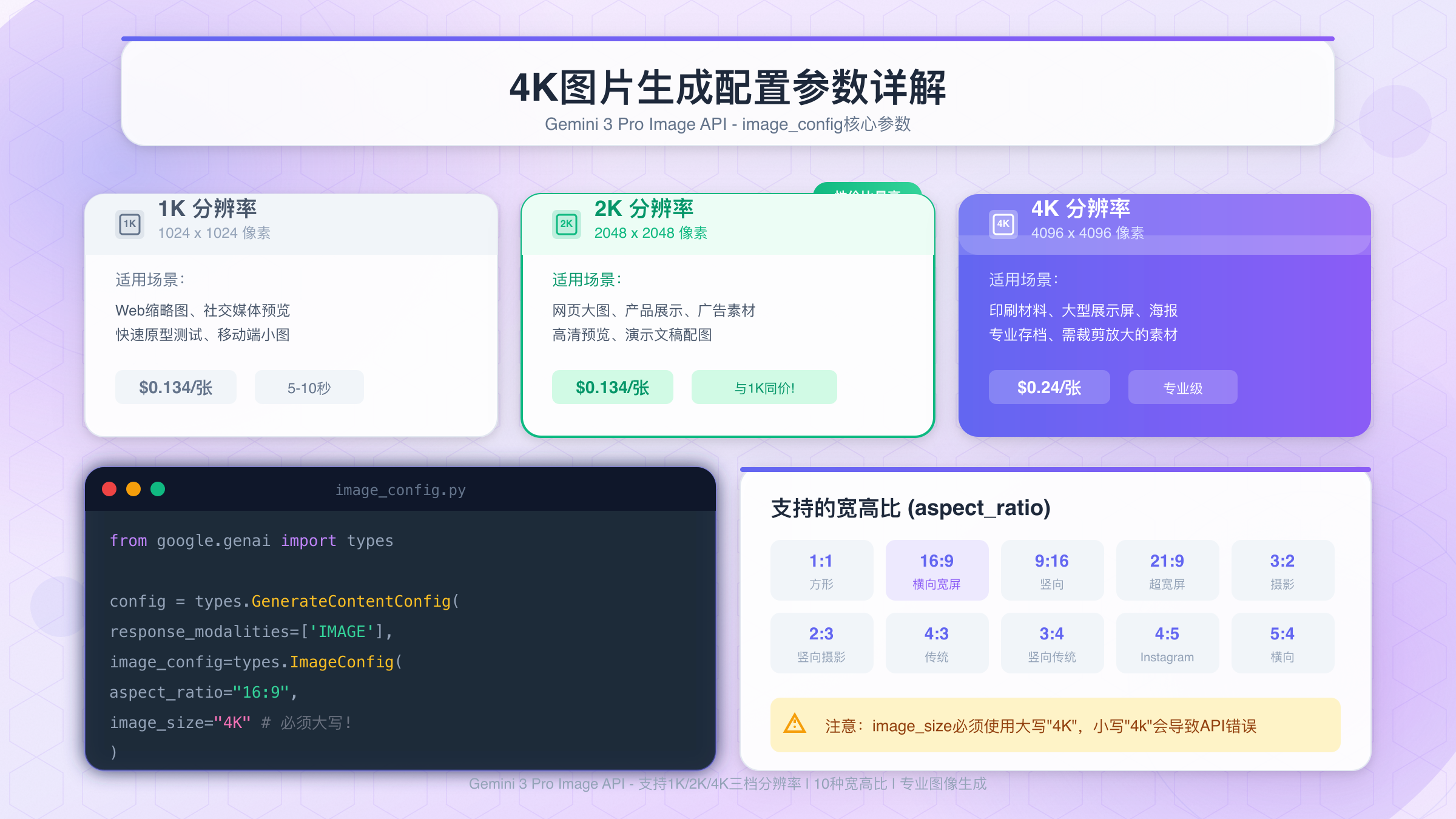 aspect_ratio参数控制图片的形状。Gemini 3 Pro支持10种预设比例,覆盖了从社交媒体到电影级宽屏的各种场景: