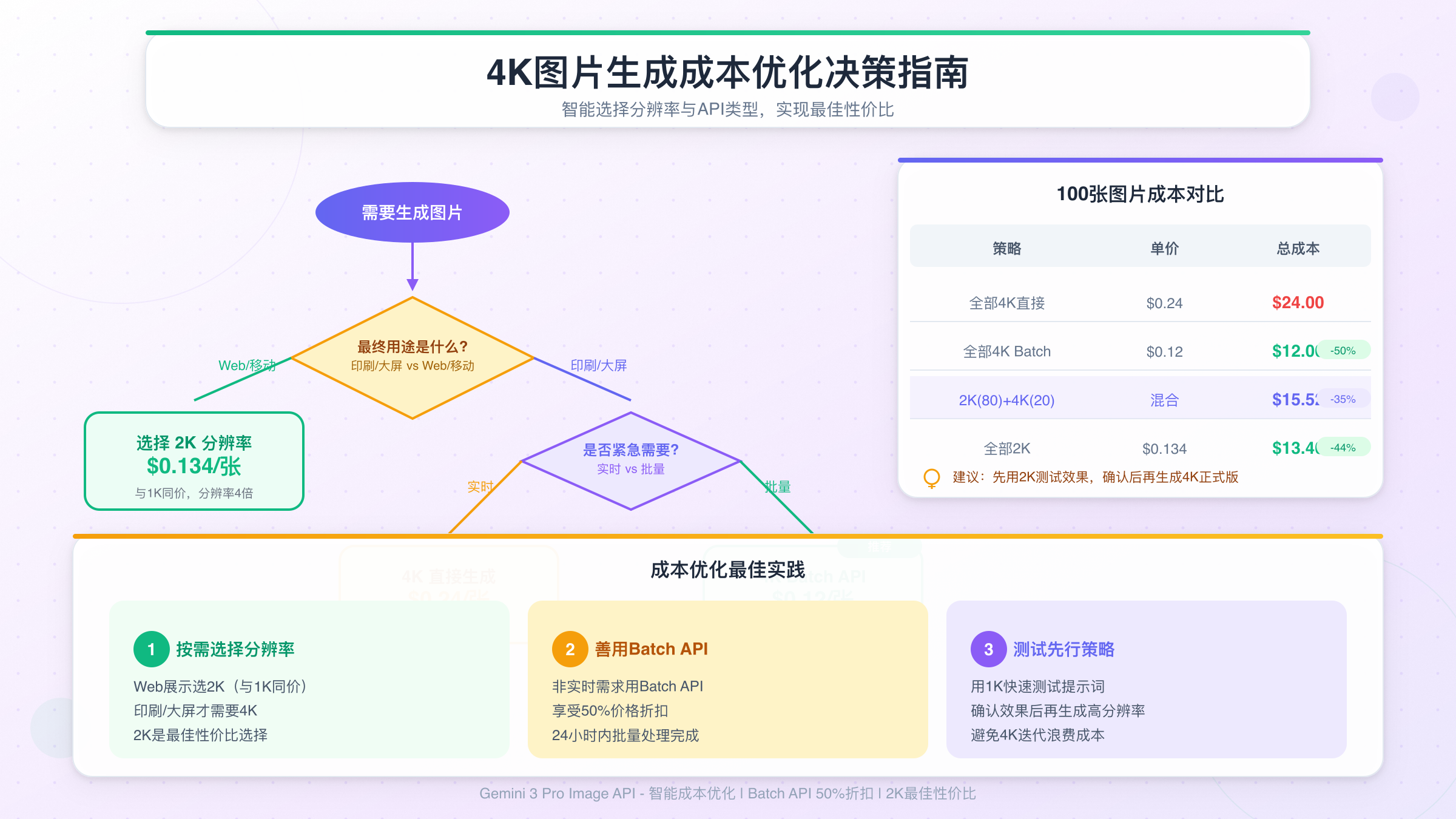 - 全部4K使用Batch API:100 × $0.12 = $12(节省50%)