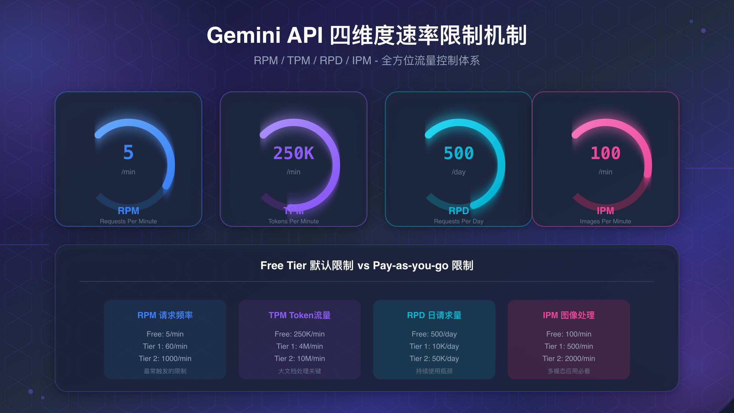 要彻底解决RESOURCE_EXHAUSTED错误,首先需要理解Google为Gemini API设置的四维度速率限制体系。这套机制的设计目的是确保资源在所有用户之间公平分配,防止任何单一用户过度占用服务器资源。每个维度都独立追踪,只要触发其中任何一个限制,你的请求就会被拒绝并返回429错误。