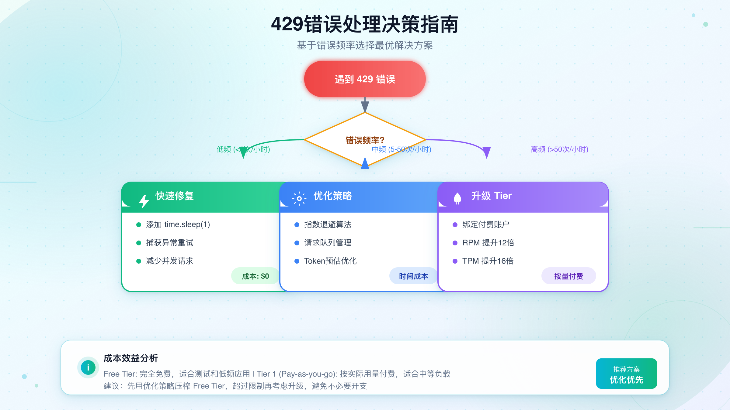 评估当前痛点的严重程度是第一步。如果429错误只是偶尔出现,且不影响核心业务流程,那么实施指数退避重试通常就足够了。如果错误频繁出现导致用户体验明显下降,或者批处理任务无法按时完成,就需要考虑更进一步的优化措施。如果问题已经严重到影响业务收入或用户留存,直接升级到付费层级可能是最经济的选择。