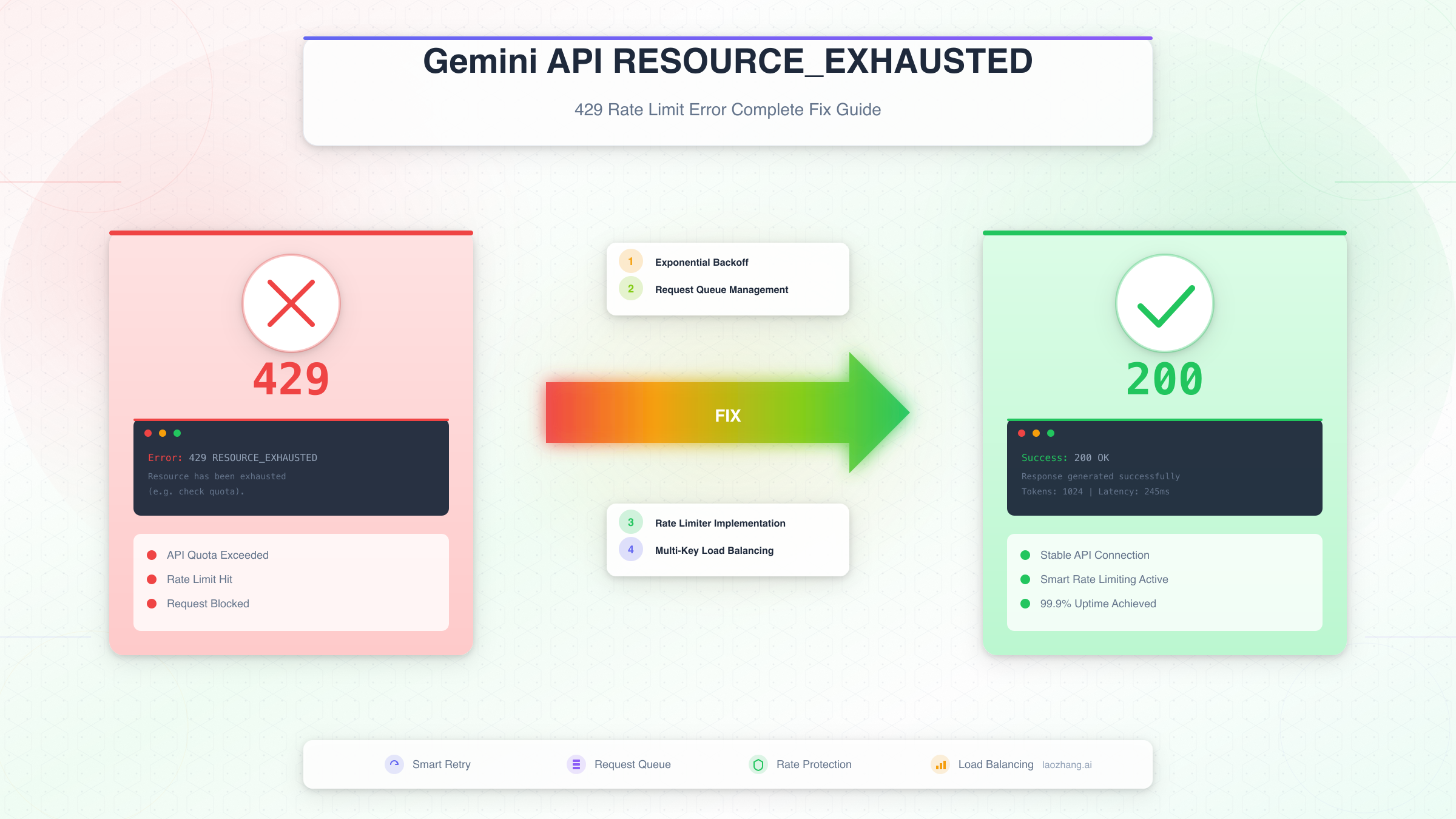 深入解析Gemini API 429 RESOURCE_EXHAUSTED错误的根本原因,提供指数退避重试、配额优化、模型切换等7种经过验证的解决方案,包含Python/JavaScript生产级代码示例