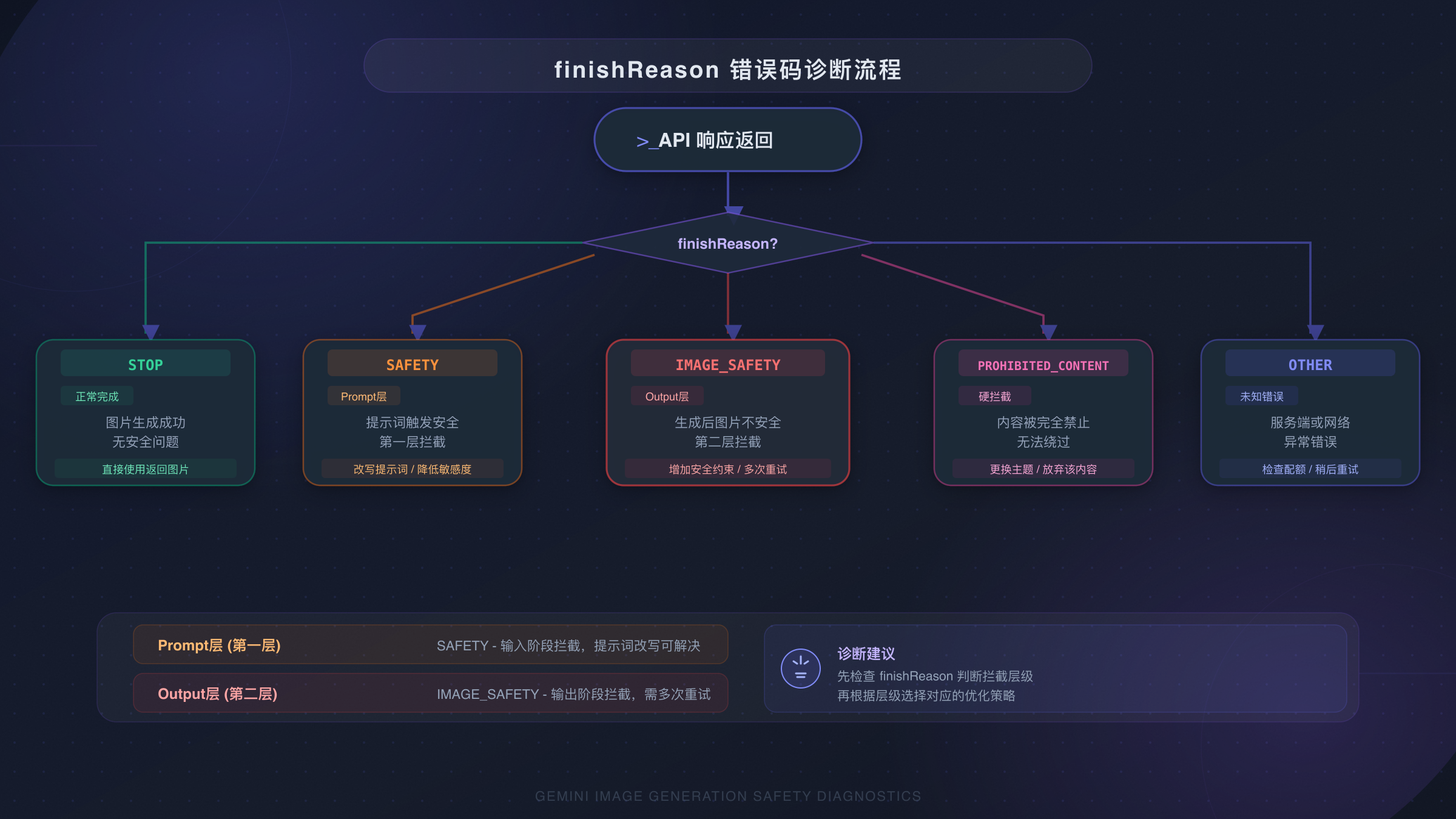 finishReason。如果是STOP但无图片,检查responseModalities参数。如果是SAFETY,查看safetyRatings找出触发类别并调整阈值。如果是IMAGE_SAFETY/PROHIBITED_CONTENT/OTHER,进入提示词优化流程。