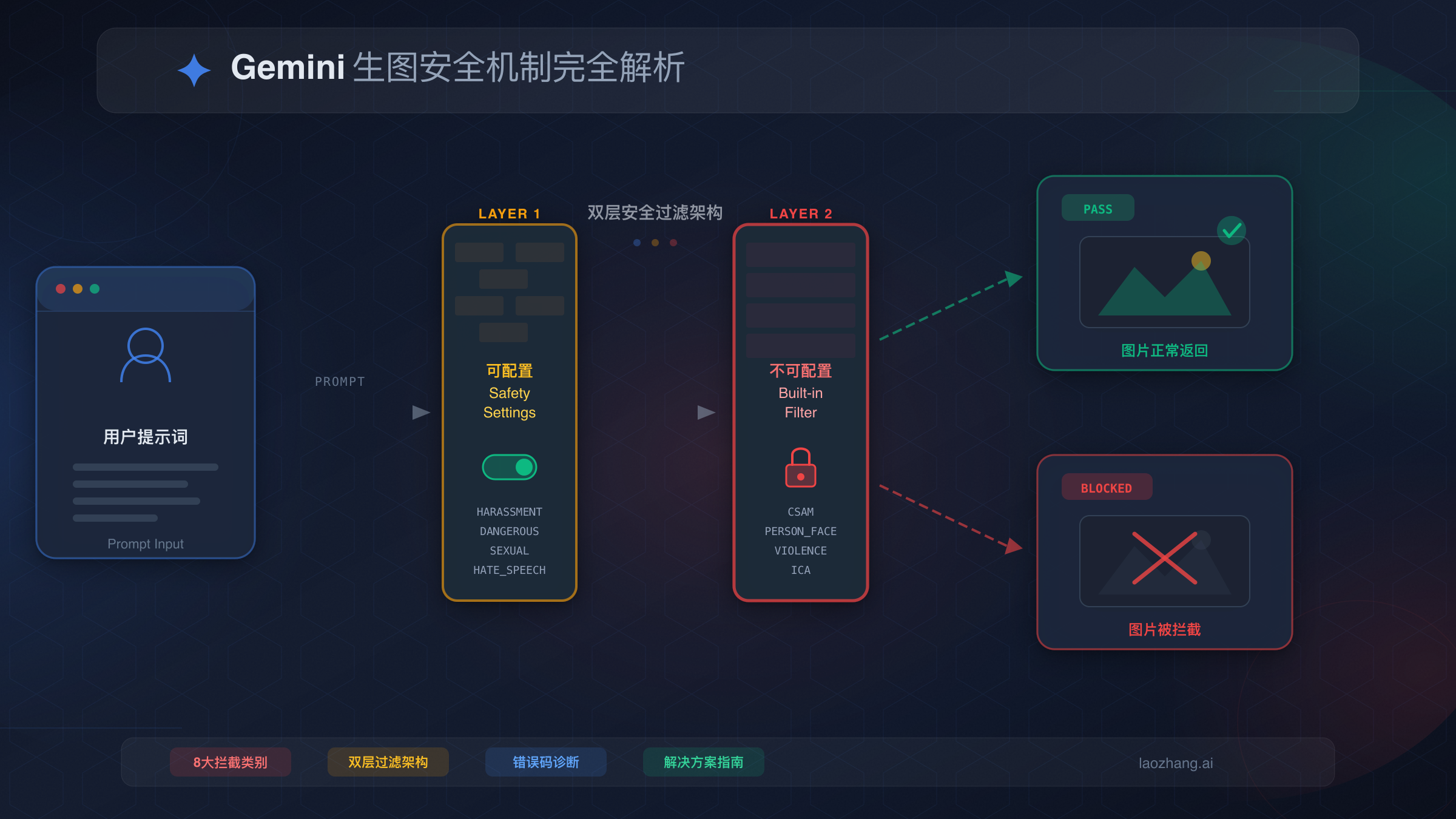 深度解析Gemini图片生成的双层安全过滤架构,涵盖8大拦截类别、finishReason错误码诊断、Layer 1可配置过滤与Layer 2不可绕过机制、提示词优化策略和SynthID水印机制。