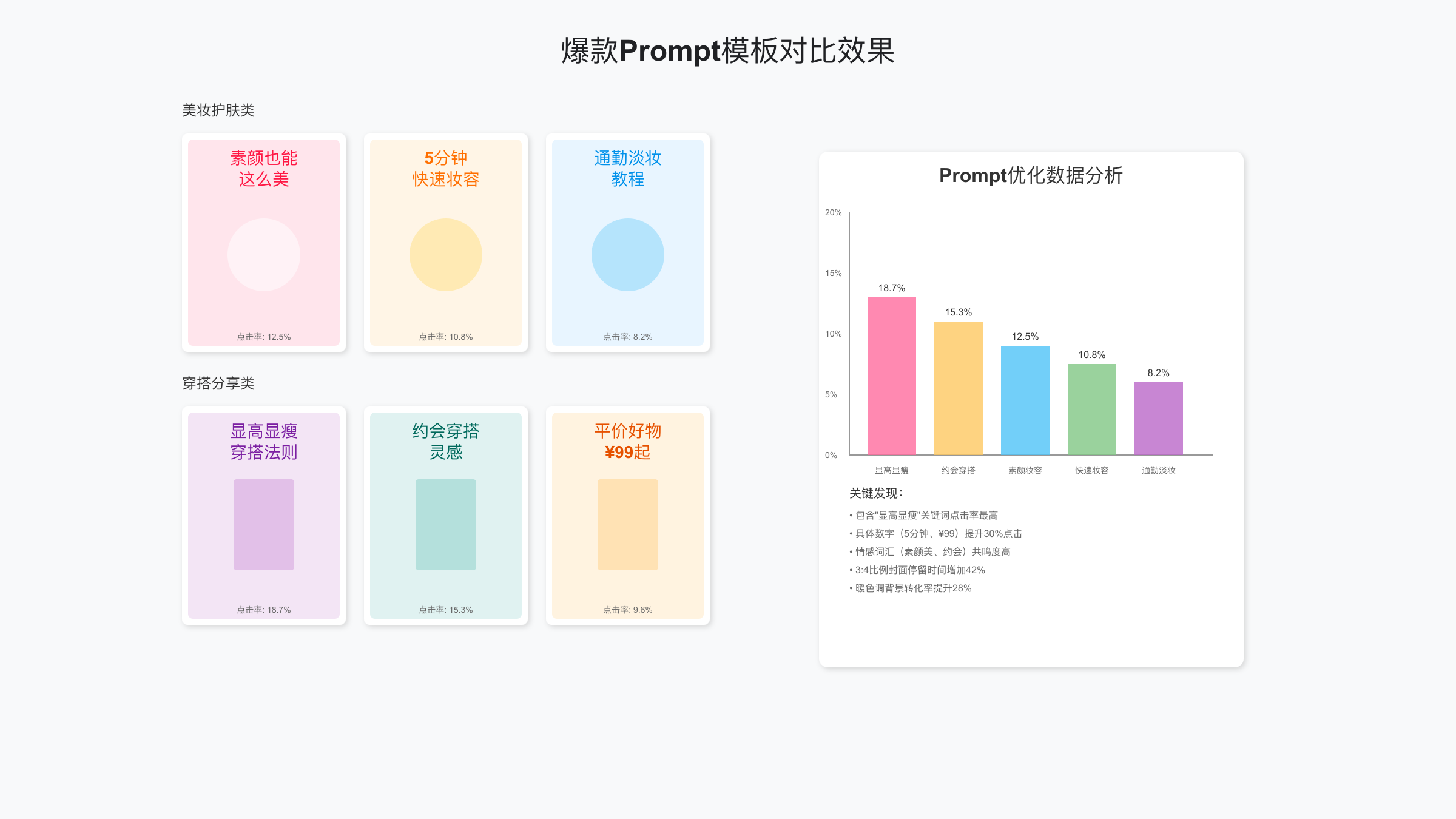 色彩选择对点击率有显著影响。根据实际运营经验,以下色系在小红书信息流中表现最佳:粉色系(美妆/穿搭类)、暖白色系(家居/生活类)、高饱和彩色(好物推荐/测评类)、深色系+亮色文字(科技/知识类)。在AI生成Prompt中指定色系可以确保封面与你的账号调性一致。