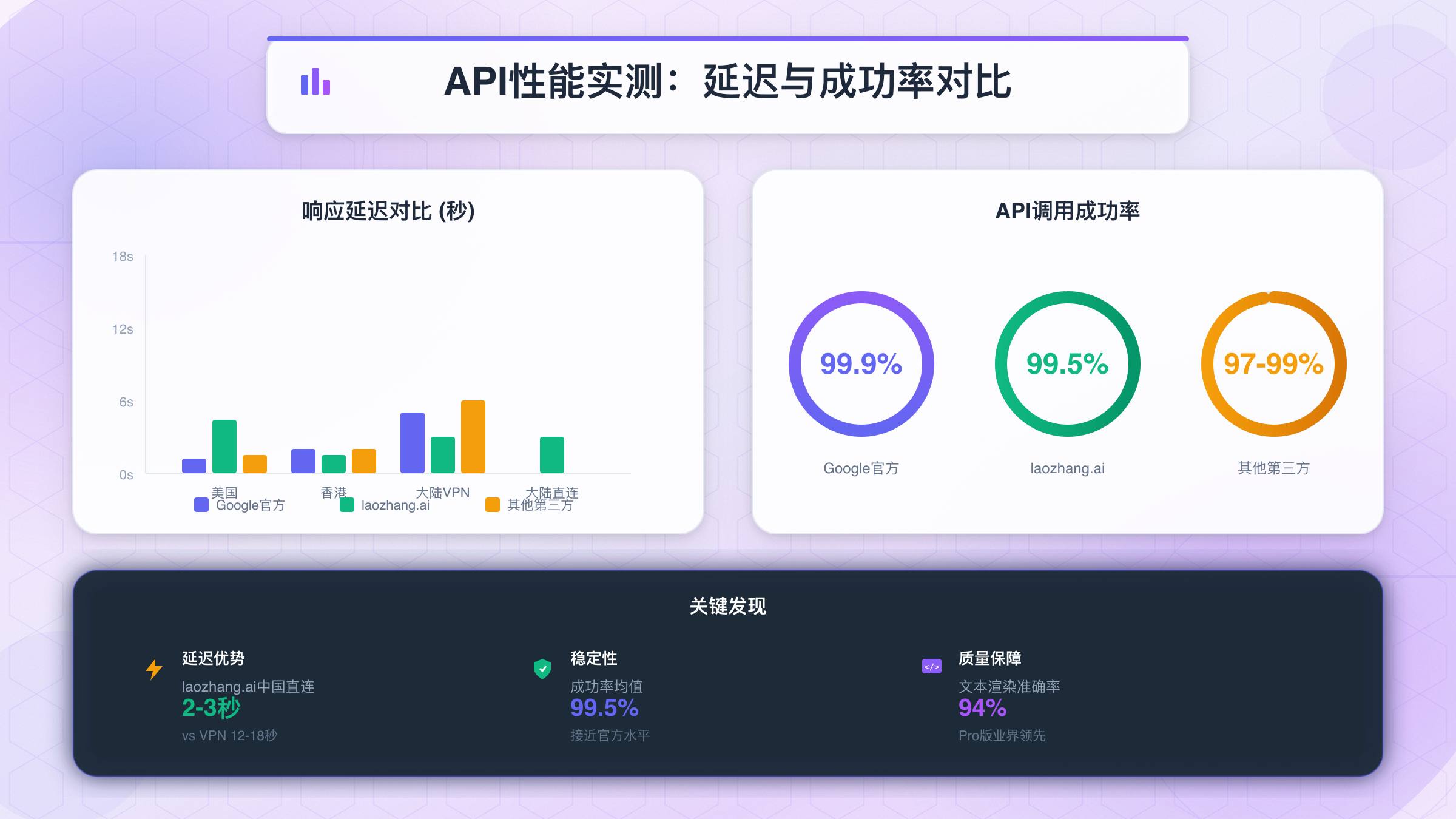 Google官方API的99.9%成功率确实是行业标杆。laozhang.ai的99.5%成功率略低,主要原因是作为中转服务,需要额外承担一层网络传输的不确定性。但考虑到0.5%的失败率对应的重试成本非常低(每万次请求约50次重试),在大多数场景下这是完全可接受的。