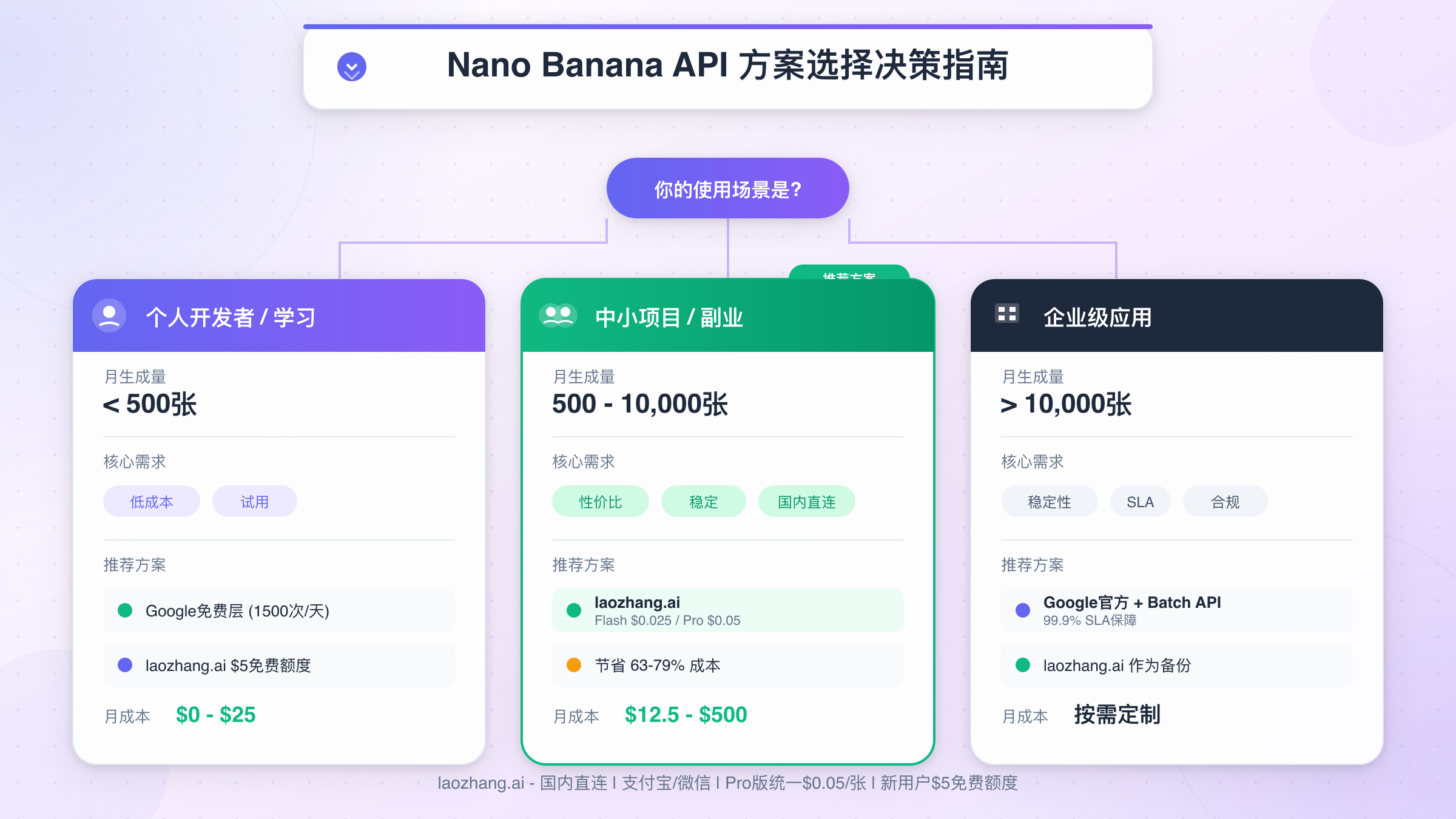 | 个人开发者/学习 | <500张 | 低成本试用 | Google免费层+laozhang.ai | $0-25 |