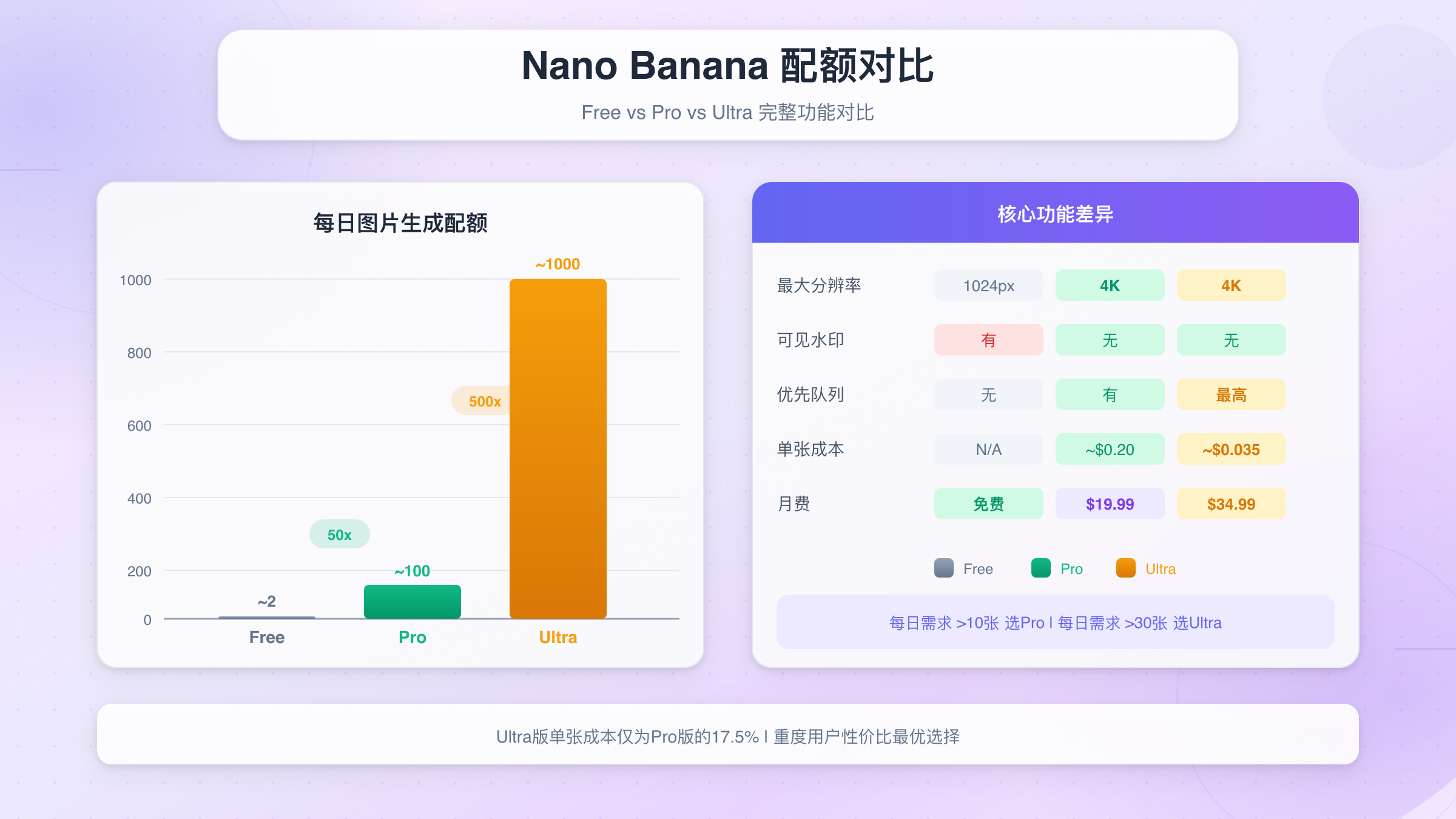 从单张成本的角度来分析,Pro版按月费换算,每张图片的成本约为$0.20(假设每天使用100张)。而Ultra版的单张成本可以低至$0.035左右。如果你每天的图片生成需求超过10张,Pro版在经济上就开始变得划算;超过30张时,Ultra版则更具性价比。