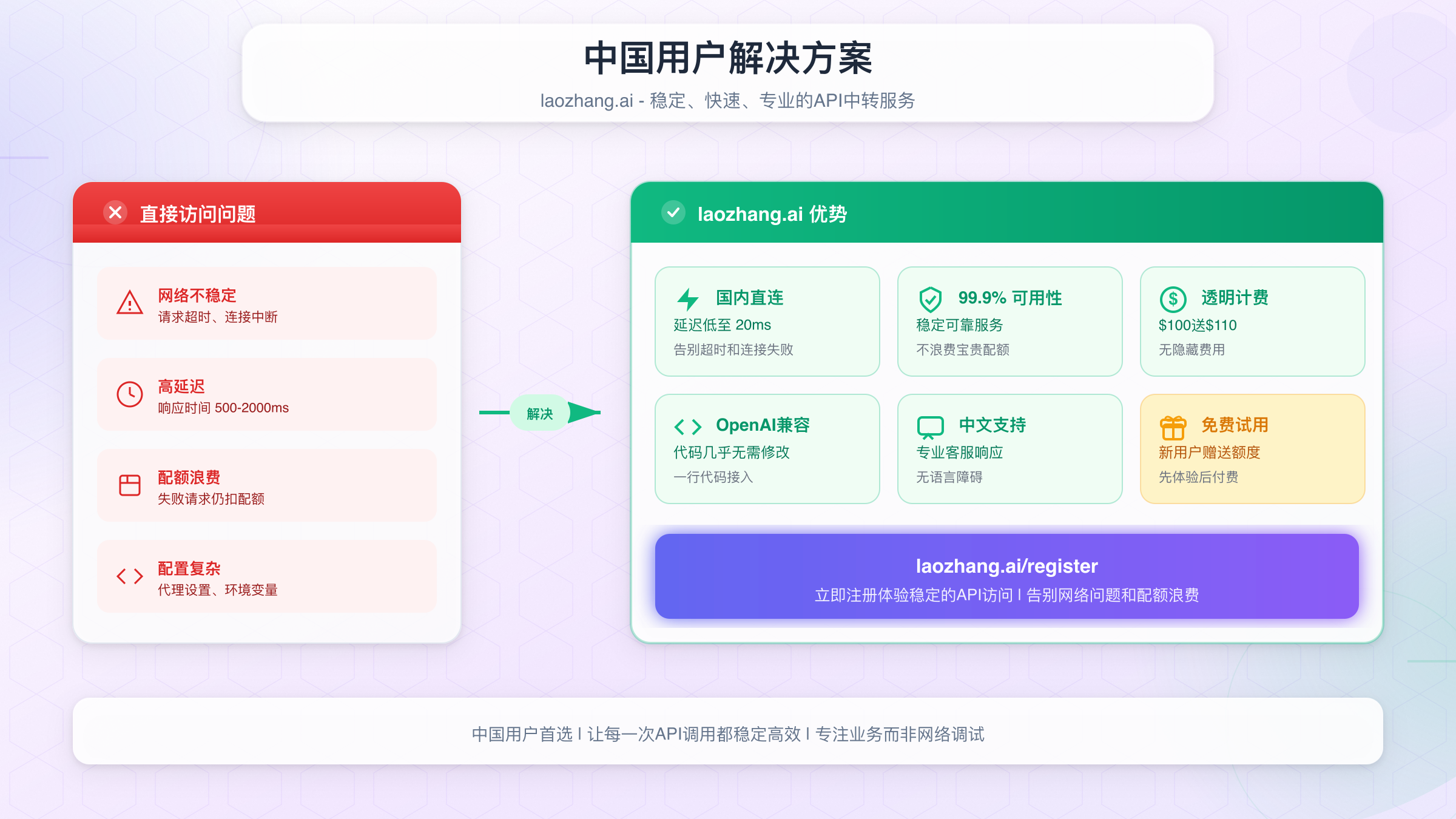 相比直接使用Google API的复杂配置和不稳定性,laozhang.ai 让中国开发者可以专注于业务逻辑本身。更重要的是,你不再需要担心珍贵的免费配额因为网络问题而白白浪费。新用户注册即可获得免费额度试用,亲身体验稳定性差异。