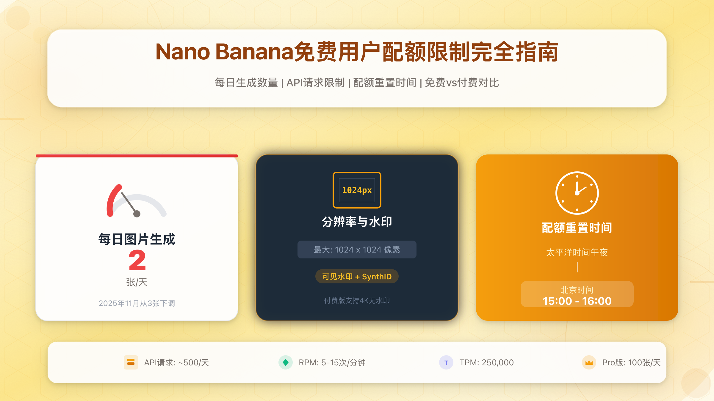 直接回答你最关心的问题:Nano Banana免费用户每天可以生成约2张图片(2025年11月从3张降至2张),最大分辨率为1024像素,并且图片会带有可见水印。配额在太平洋时间午夜重置,对应北京时间下午4点左右。