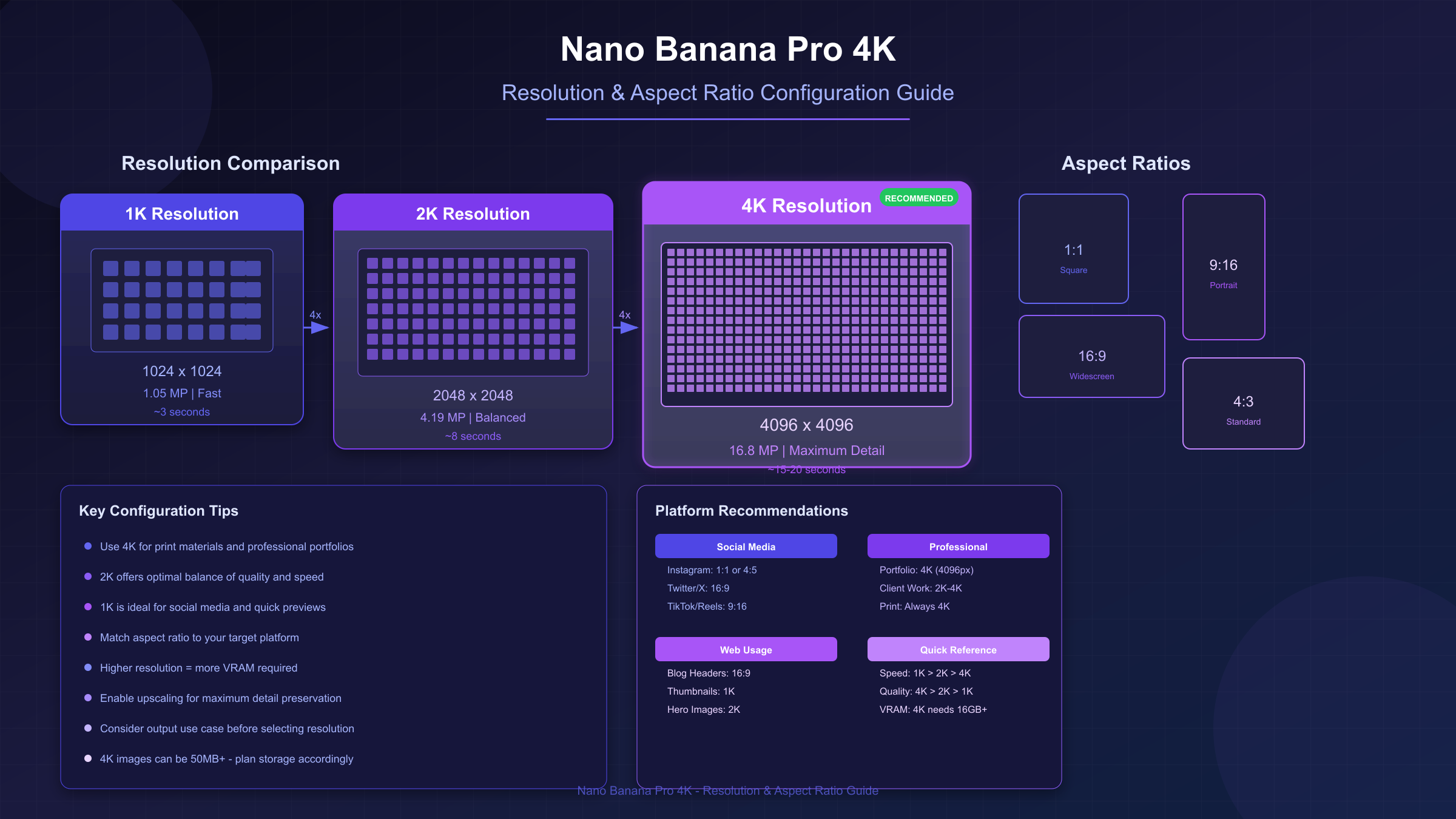 当你需要生成一张可以用于印刷、大型显示屏或电商详情页的高清图片时,Nano Banana Pro的原生4K生成能力就成为了最佳选择。这款由Google推出的Gemini 3 Pro Image模型,能够直接输出高达4096×4096像素(约1600万像素)的图像,无需任何升频处理就能获得专业级的画质表现。