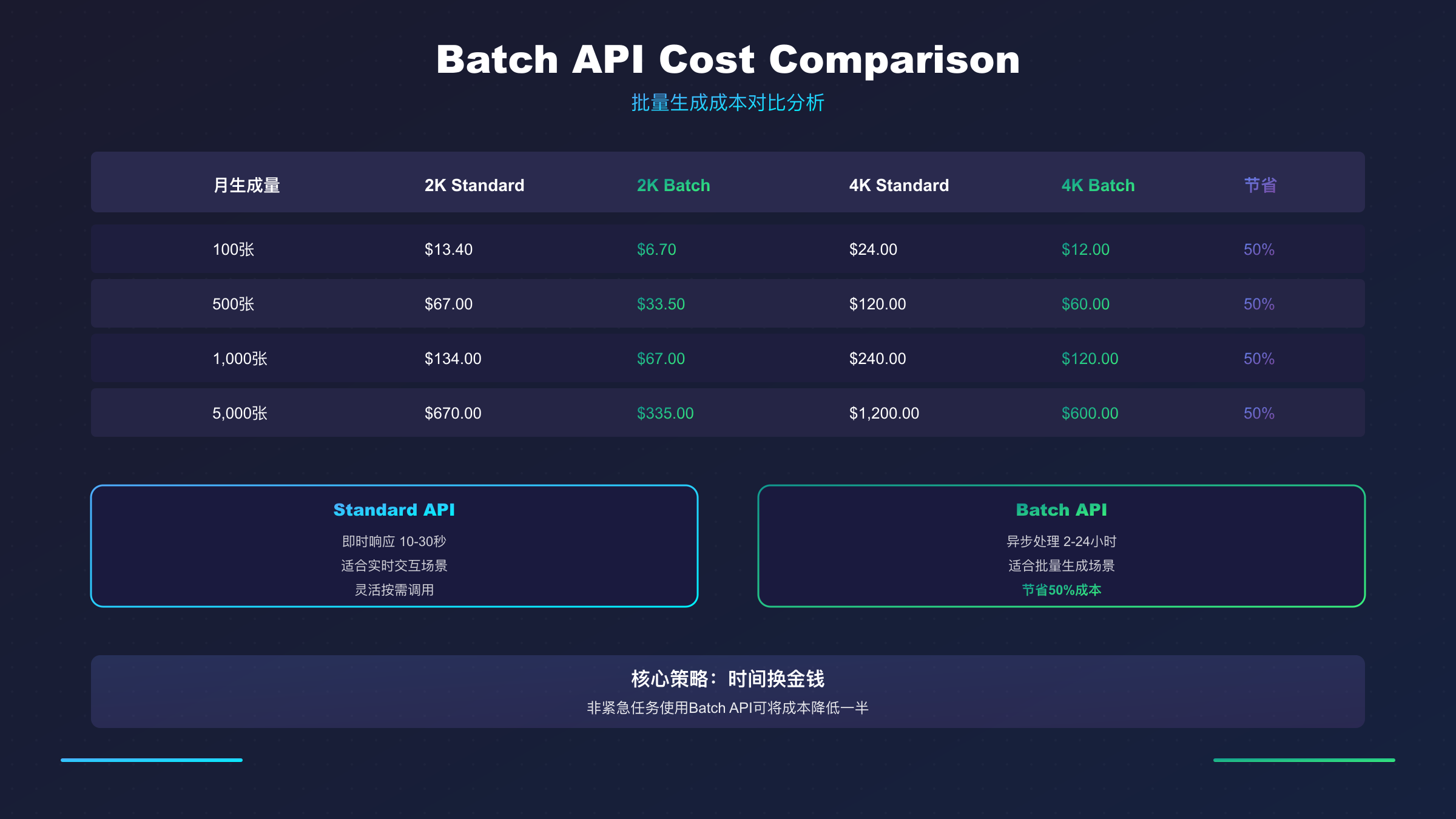 除了标准API调用,Google还提供了Batch API批量处理选项,可以享受高达50%的折扣。使用Batch API时,2K图片降至$0.067每张,4K则降至$0.12每张。代价是处理时间从即时响应(通常10-30秒)延长到2-24小时的异步处理。对于不需要实时生成的场景,如批量生成营销素材或产品图库,Batch API是极具吸引力的选择。