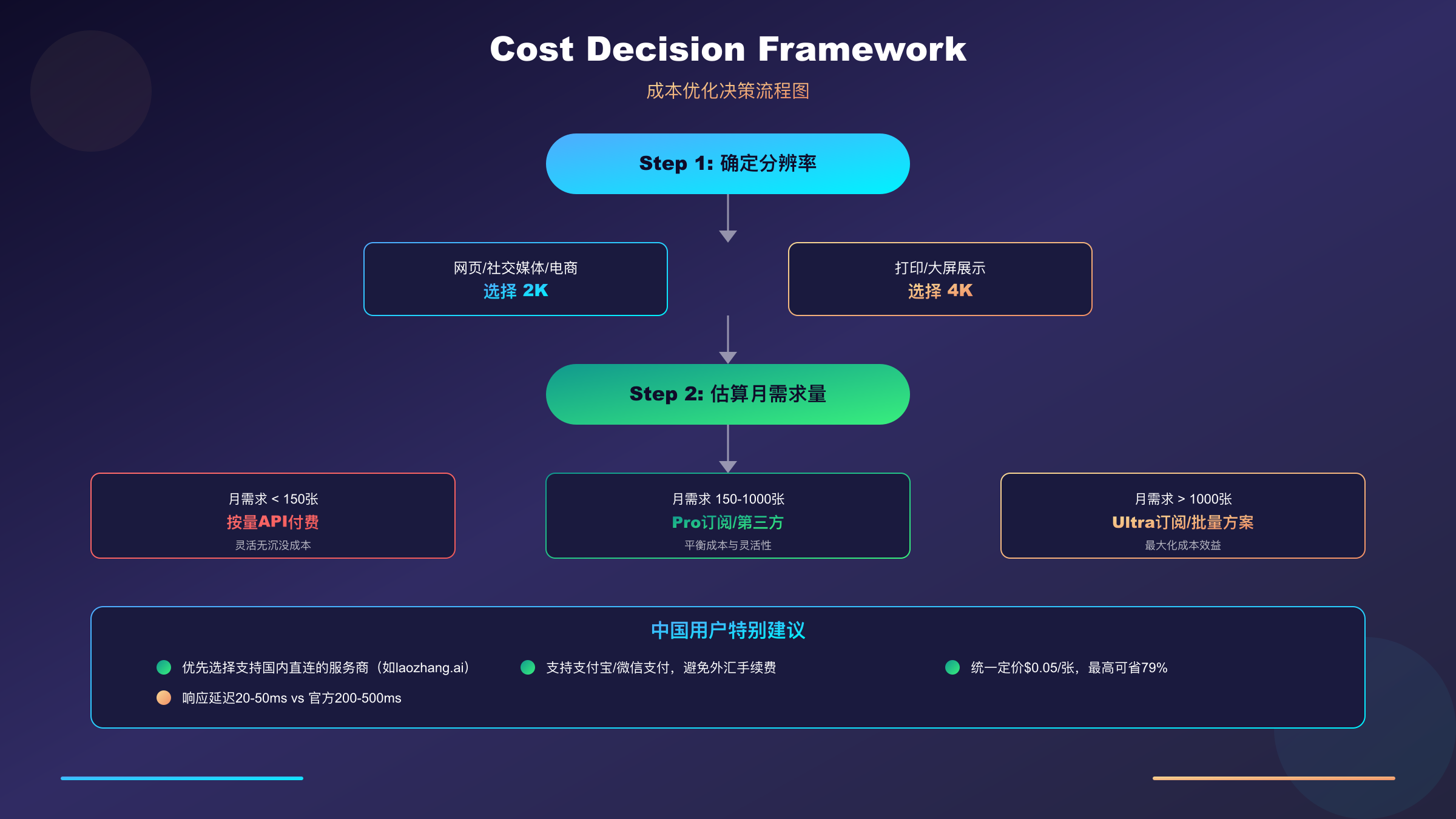 另一个策略是智能分辨率选择。如前所述,很多场景并不需要最高分辨率。在批量生成时,可以根据用途对图片进行分类:需要打印的用4K,仅用于网页展示的用2K。这种混合策略在大规模生成时可以显著降低平均成本。假设一个1000张图片的批次中,只有10%需要4K分辨率,采用混合策略后,总成本从纯4K的$120.00降至$73.70(900张2K×$0.067 + 100张4K×$0.12),节省近40%。