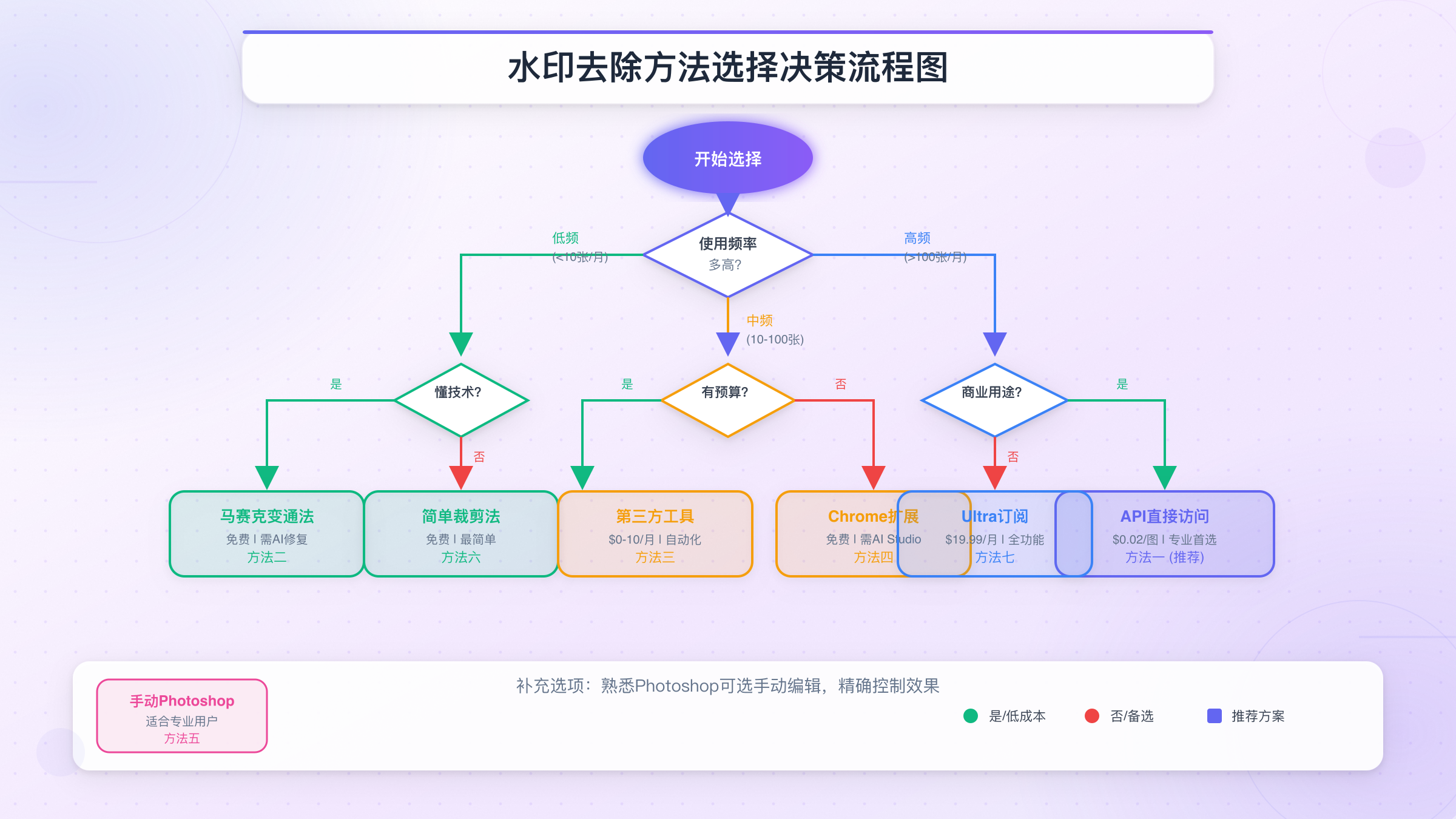 理解了水印机制之后,让我们聚焦于实际可行的解决方案。需要再次强调的是:以下所有方法都只能移除可见的Gemini星火标识,SynthID隐形水印将始终保留在图像中。如果你的使用场景对此没有顾虑,那么这些方法都能帮助你获得视觉上无水印的图像。