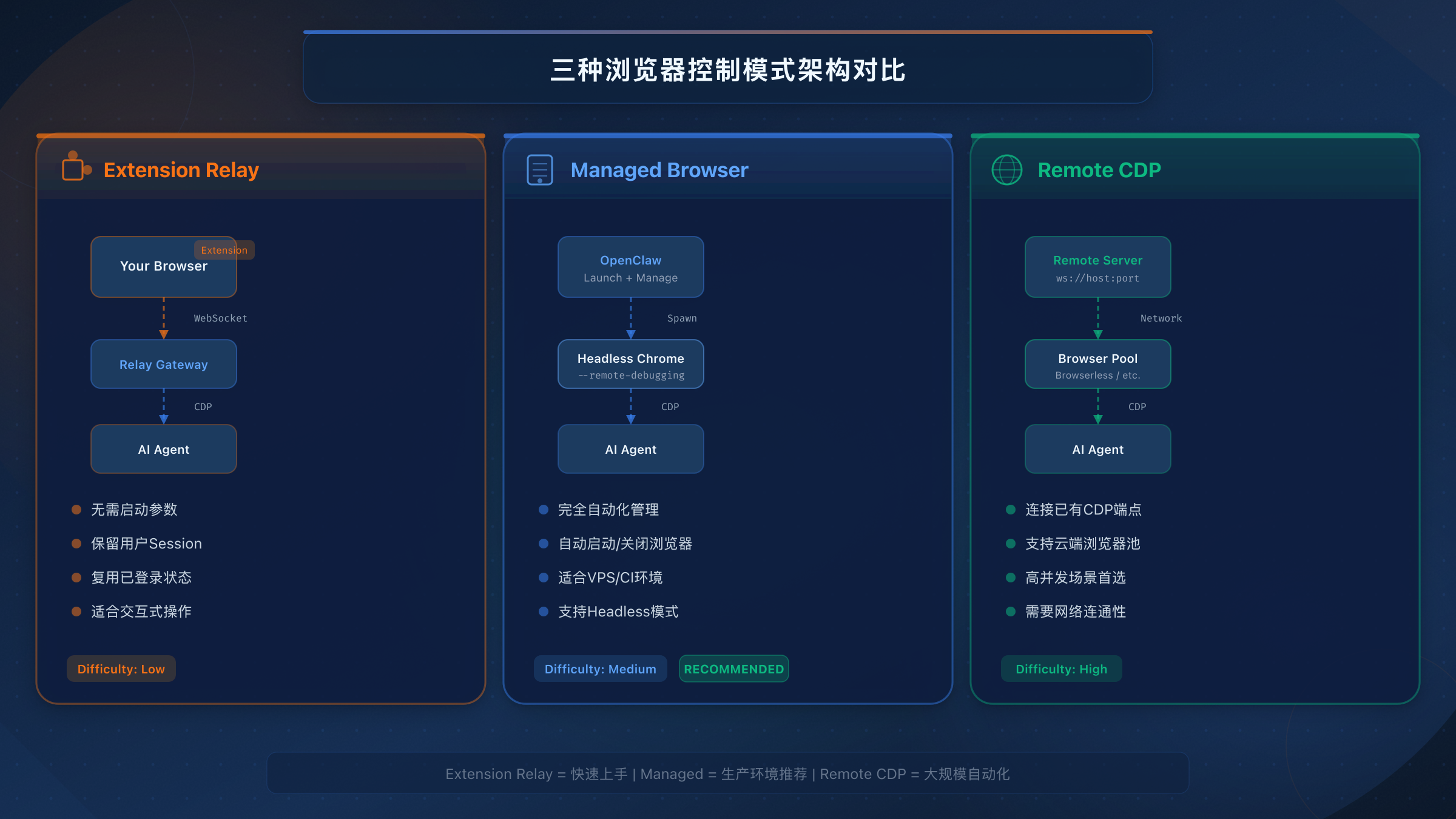 | 对比维度 | Extension Relay | Managed Browser | Remote CDP |