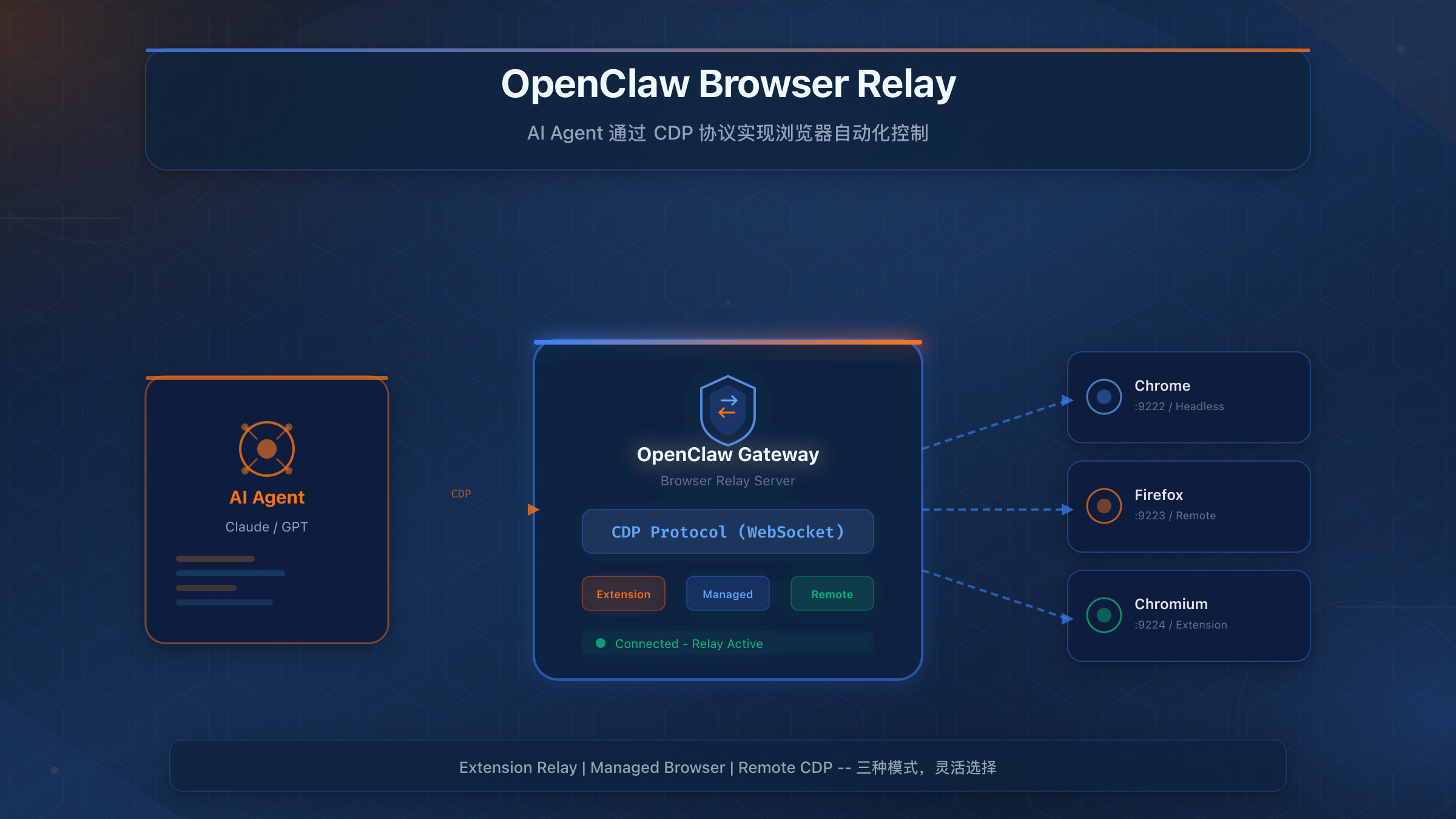 深度解析OpenClaw Browser Relay的三种浏览器控制模式、CDP协议原理、安装配置步骤和实战自动化案例。掌握Extension Relay与Managed Browser的核心差异,避开VPS部署五大坑。